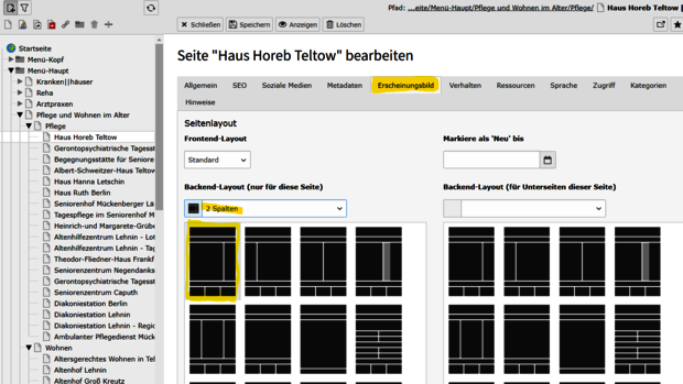 Unter "Backend-Layout" das 1. Bild ( 2 Spalten) auswählen.