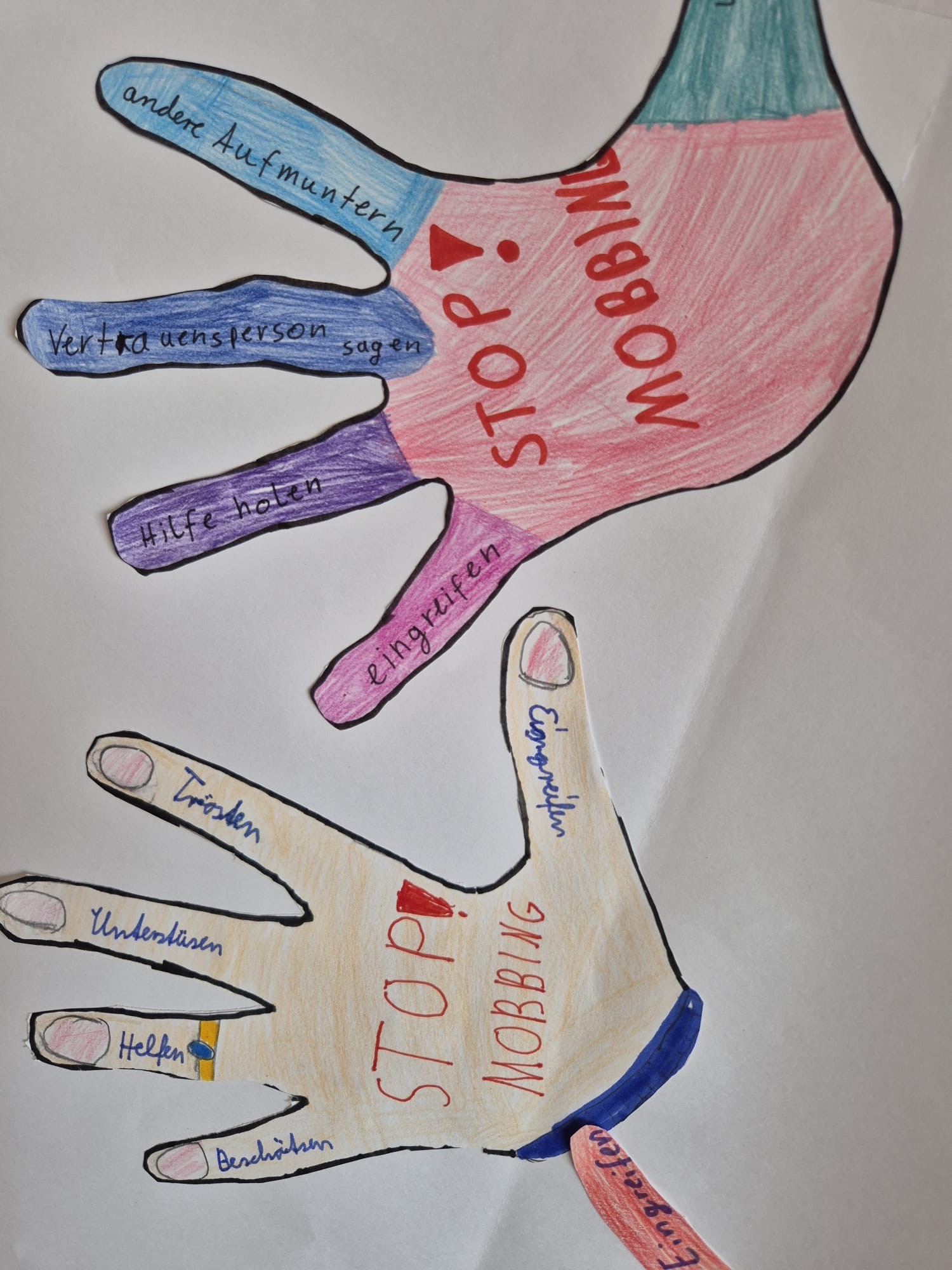 Auf ihren Händen haben sie nicht nur ein klares “Stopp” gezeigt, sondern auch konkrete Möglichkeiten notiert, wie man sich gegen Mobbing stark machen kann: Hilfe holen, Nein sagen, Zusammenhalten, bewusst mit Medien umgehen und Zivilcourage zeigen.