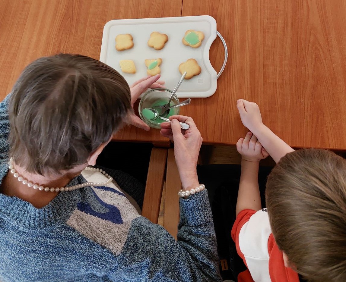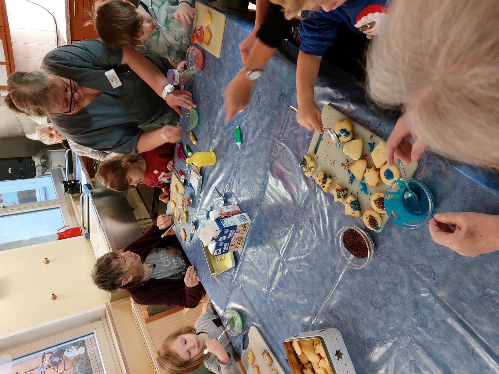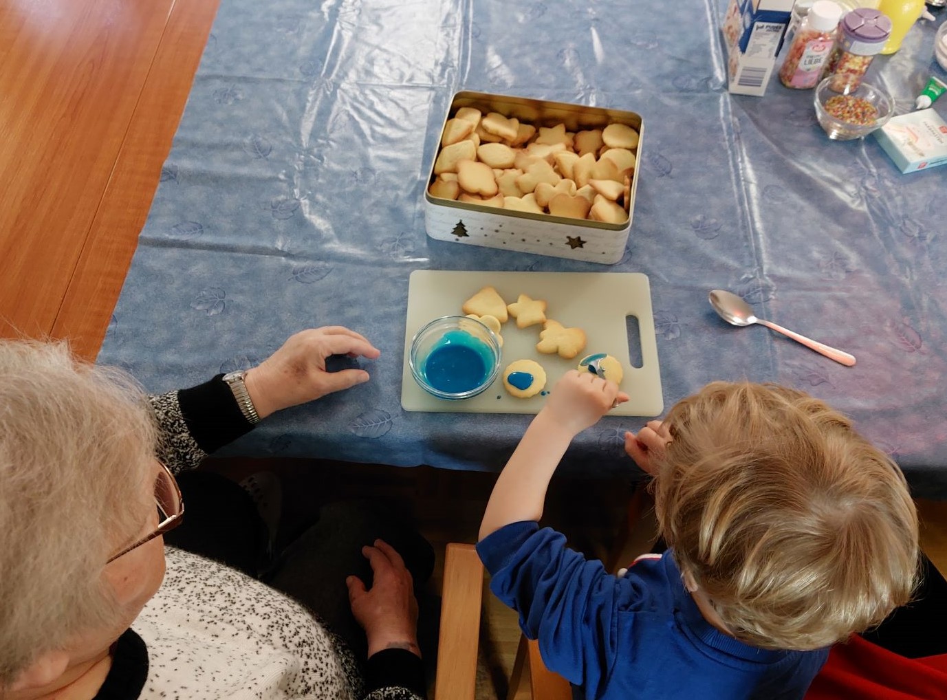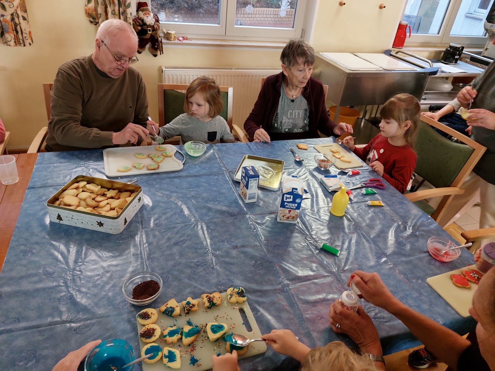 Gestern und heute besuchten Kinder aus der Kinderbetreuung Schlumpfen-Eck in Halle den Spezialbereich Demenz im Mathilde-Tholuck-Haus. Gemeinsam mit Bewohnerinnen und Bewohnern gingen sie dem Adventsbrauch nach und verfeinerten selbst gebackene Plätzchen. Das verlangte auch ein bisschen Geschicklichkeit, gemeinsam klappte das Glasieren allerdings ziemlich gut. Und auch die etwas Schüchterneren tauten bald auf und fanden Spaß an der gemeinsamen Aktion.
