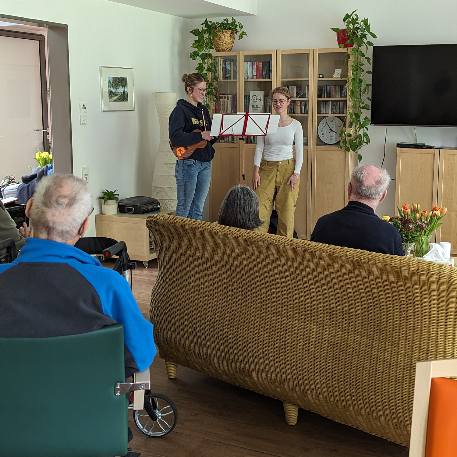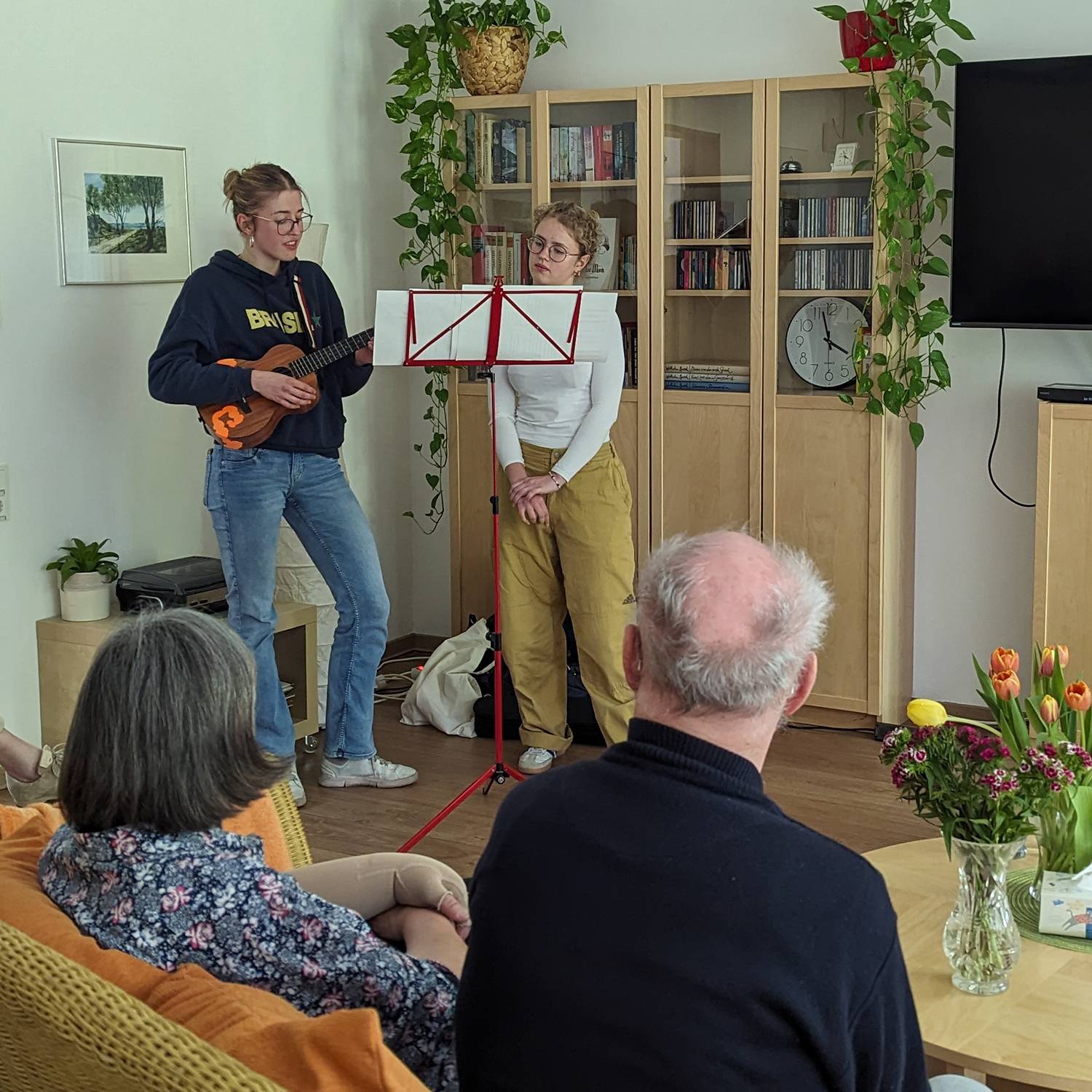 Am 7. Mai 2024 erlebten die Gäste und Mitarbeitenden im Hospiz Potsdam einen ganz besonderen Nachmittag, gefüllt mit Musik und Freude. Zwei Schülerinnen der 11. Klasse des evangelischen Gymnasiums Hermannswerder bereiteten den Gästen ein kleines Konzert. Eine der Schülerinnen spielte auf ihrer Ukulele, während beide zusammen eine Auswahl schöner Lieder sangen. Diese musikalische Darbietung brachte viel Freude und Lächeln unter die Gäste.