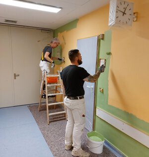 Neue Farbe für die Station F1 im Diakoniekrankenhaus Halle - in frischem Grün kontrastiert mit Türkisblau soll der Stationsbetrieb demnächst wieder aufgenommen werden. Für Patientinnen und Patienten hoffentlich eine angenehme Atmosphäre für die Genesung - und für Mitarbeitende Räume, in denen sie gern arbeiten.
