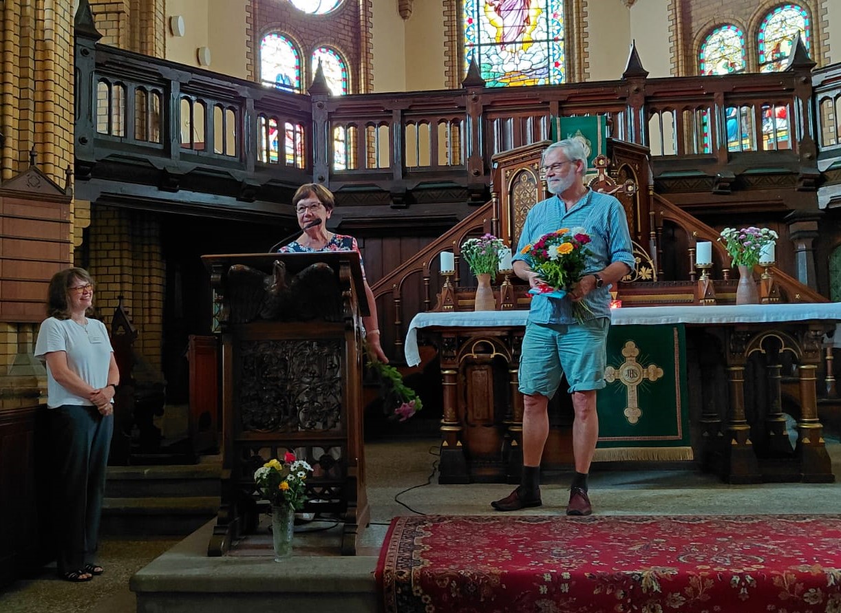 Seelsorgerin Marlies Lang gratulierte im Namen des Vorstandes mit einem Blumenstrauß. Auch die ehemalige Mitarbeiterin Helgard Ehnert wandte sich mit einem Grußwort an die Gäste und erinnerte an die Einstellung von Kantor Tim-Dietrich Meyer vor fast 35 Jahren. Seit 1991 spielt der Kirchenmusiker mittwochs jeweils 16 Uhr für 20 Minuten auf der Rühlmann-Orgel von 1908. Dieses musikalische Angebot soll vorrangig dazu dienen eine Weile inne zu halten, Ruhe zu finden, zuzuhören und den Gedanken freien Lauf zu lassen. Gerade im Umfeld des Krankenhauses ist es eine gern genutzte Gelegenheit. Zum Jubiläum erklang die Orgel eine halbe Stunde.