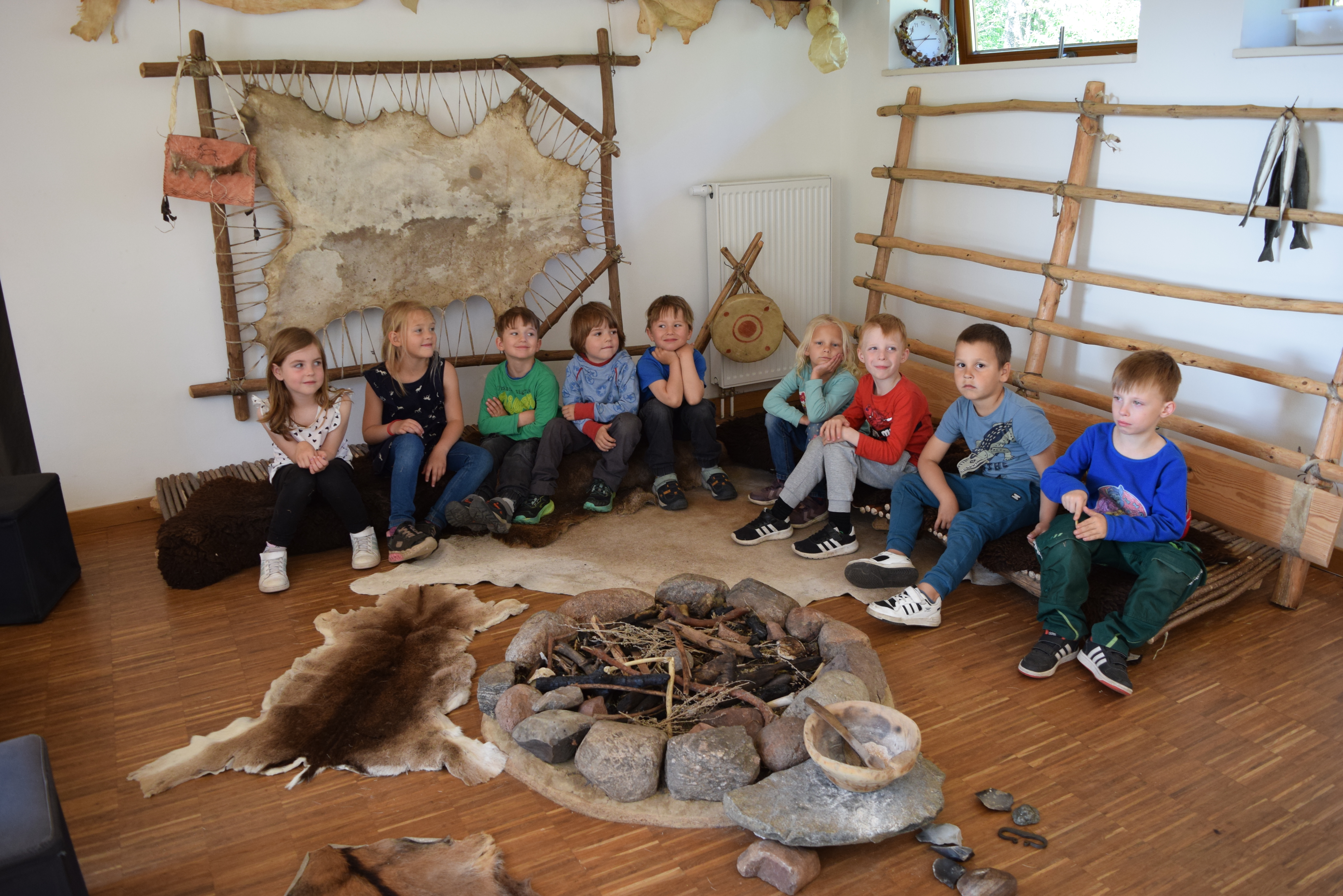 Direkt nach der Ankunft ging es zurück in die Steinzeit! Wie lebten die Menschen früher? Wie wurde Feuer entdeckt – und wofür war es so wichtig? Die Kinder durften selbst mit Stöckern versuchen, Feuer zu machen – eine spannende Reise in die Vergangenheit, bei der Geschichte lebendig wurde