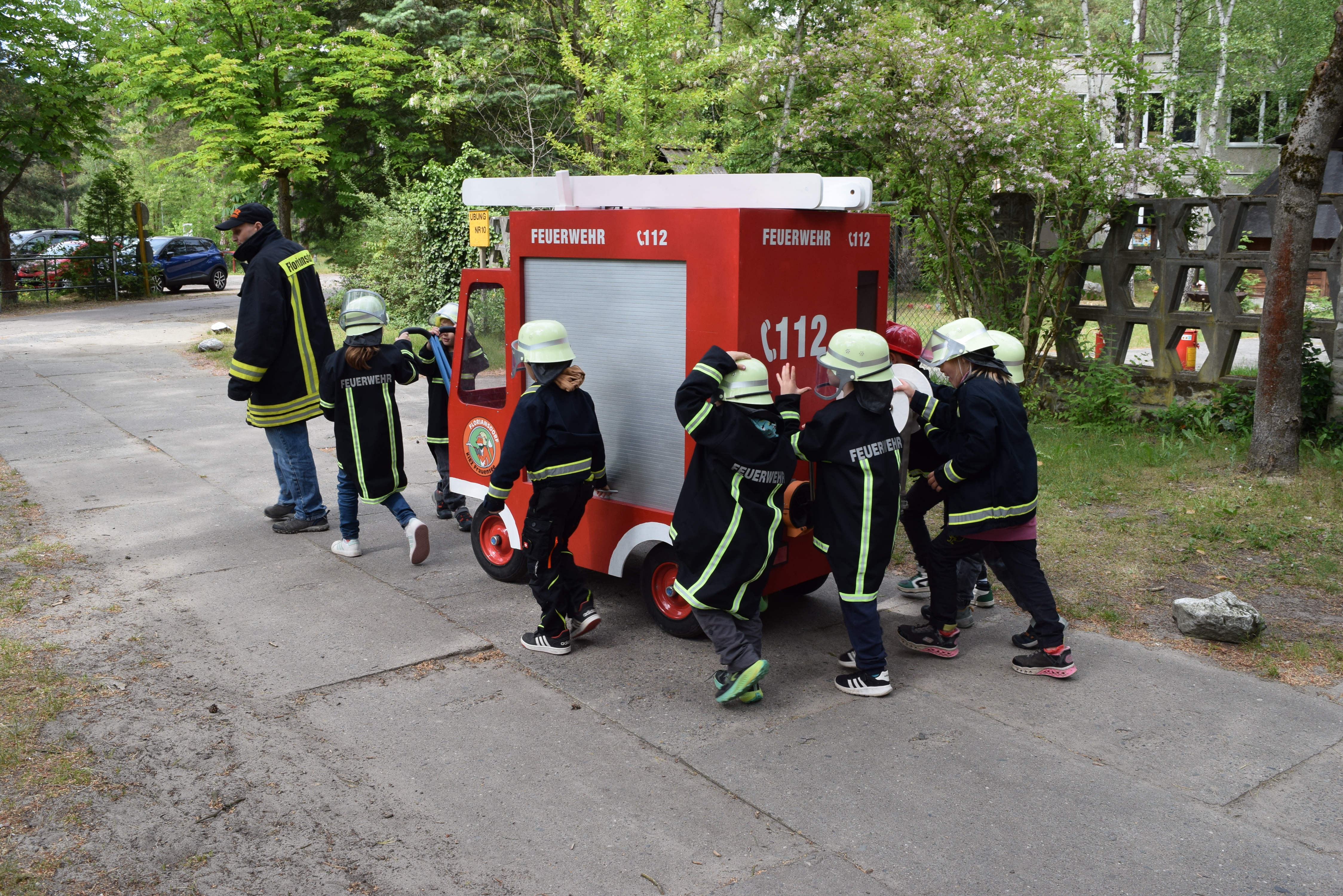 Später erlebten die Kinder ihren ersten Feuerwehreinsatz in der Feuerwache: Sirene, Einsatzkleidung, Helm – und los ging’s im Feuerwehrauto zum (simulierten) Löscheinsatz.