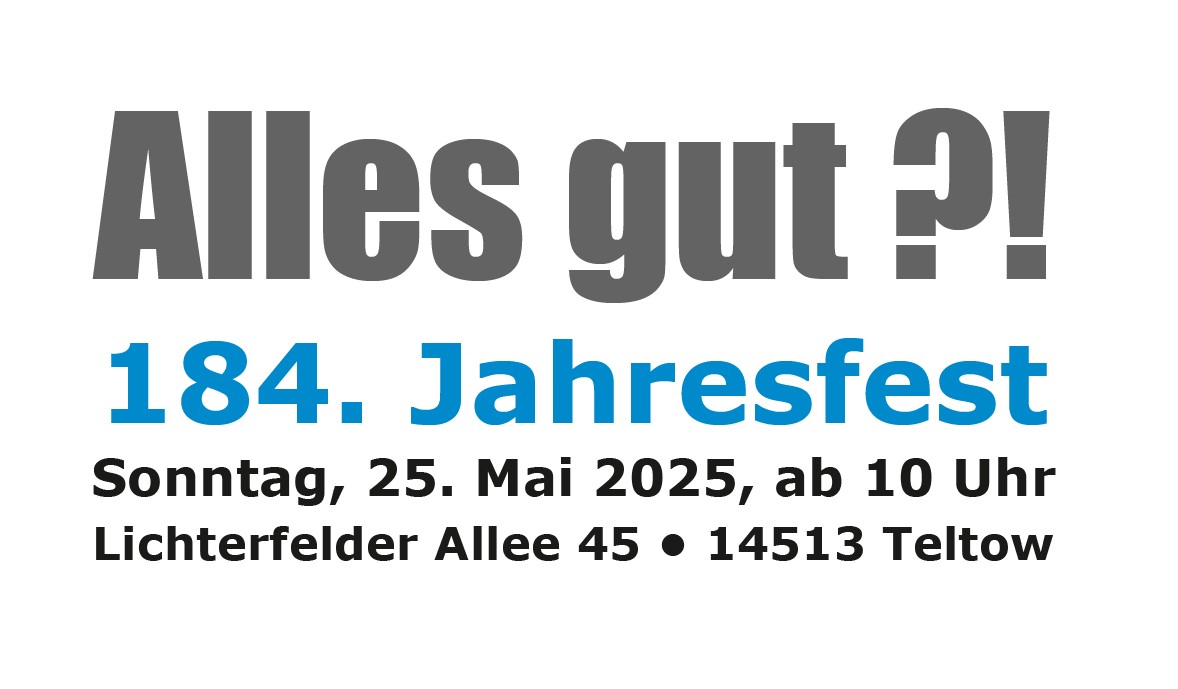 Am Sonntag, dem 25. Mai 2025 feiern wir ab 10 Uhr unser 184. Jahresfest. Seien Sie uns herzlich an der Lichterfelder Allee 45 in 14513 Teltow willkommen!