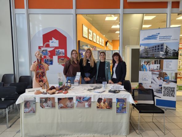Bianca Dittmeyer, Praxisanleiterin im Evangelischen Krankenhaus Ludwigsfelde-Teltow, war im September gemeinsam mit drei Auszubildenden des 1. Lehrjahres auf der Ausbildungsmesse im Südringcenter Rangsdorf. Das Organequiz wurde gut angenommen und einige Interessenten ließen sich auch den Blutdruck messen. Durch die offene und zugängliche Art unserer Auszubildenden konnten wir viel Infomaterial zu den Ausbildungen der Pflegefachfrau/-mann, Operationstechnischen Assistenten, Krankenpflegehelfer und den Studiengang Bachelor of Nursing verteilen. Wir haben uns sehr über das große Interesse der Schülerinnen und Schüler gefreut.