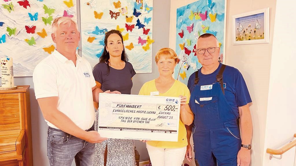 Der Standort Luckau der Firma GWE GmbH hat im Rahmen des Tages der offenen Tür im Juni 2023 Spenden für das Hospiz Luckau gesammelt und die Spendensumme anschließend auf 500€ aufgerundet. Im August erfolgte die Spendenübergabe durch den Werkleiter Herr Thomas Heik und den Mitarbeitenden Elke Pohland Siegfried Teske.