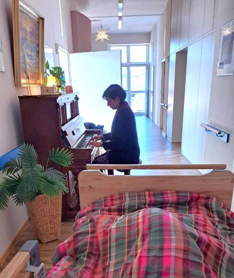 Am vergangenen Wochenende durften wir im Hospiz einen ganz besonderen Moment erleben. Der Bereich rund um unser Klavier verwandelte sich für kurze Zeit in einen kleinen Konzertort. Unser Gast wurde mit seinem Bett dorthin gebracht, sodass er die Musik ganz nah und unmittelbar erleben konnte.