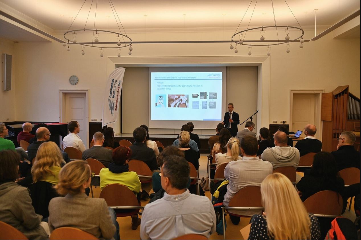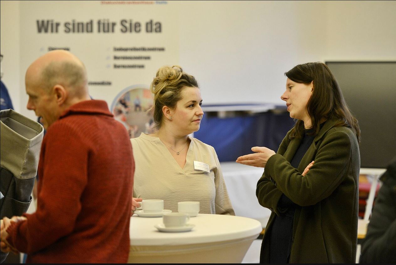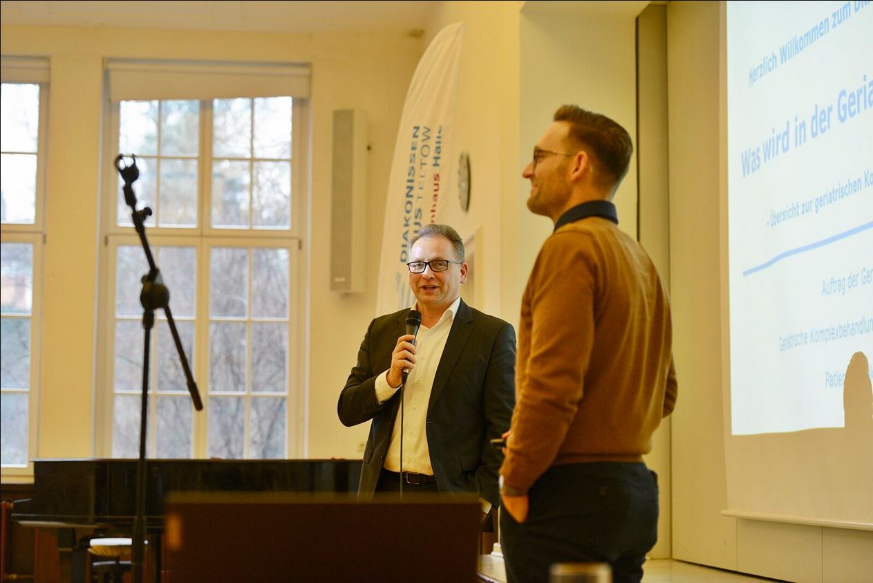 Zu den erstmals organisierten Netzwerkgesprächen im Diakoniekrankenhaus Halle kamen am 26. Februar 2025 etwa 50 Kolleginnen und Kollegen aus dem Krankenhaus, von kooperierenden Einrichtungen und zuweisenden Praxen. Mit vier Vorträgen wurden dabei Informationen zu strukturellen und fachlichen Neuerungen gegeben sowie Anregungen zum weiteren Austausch. Besonderes Augenmerk lag dabei auf den drei Fachzentren am Haus: dem Endoprothetikzentrum, dem Darmzentrum und dem Hernienzentrum. Außerdem stellte sich zur Veranstaltung der ab 1. März 2025 angestellte neue Chefarzt der Klinik für Geriatrie, Dr. med. Marvin Schober, den Kolleginnen und Kollegen mit einem Vortrag vor.