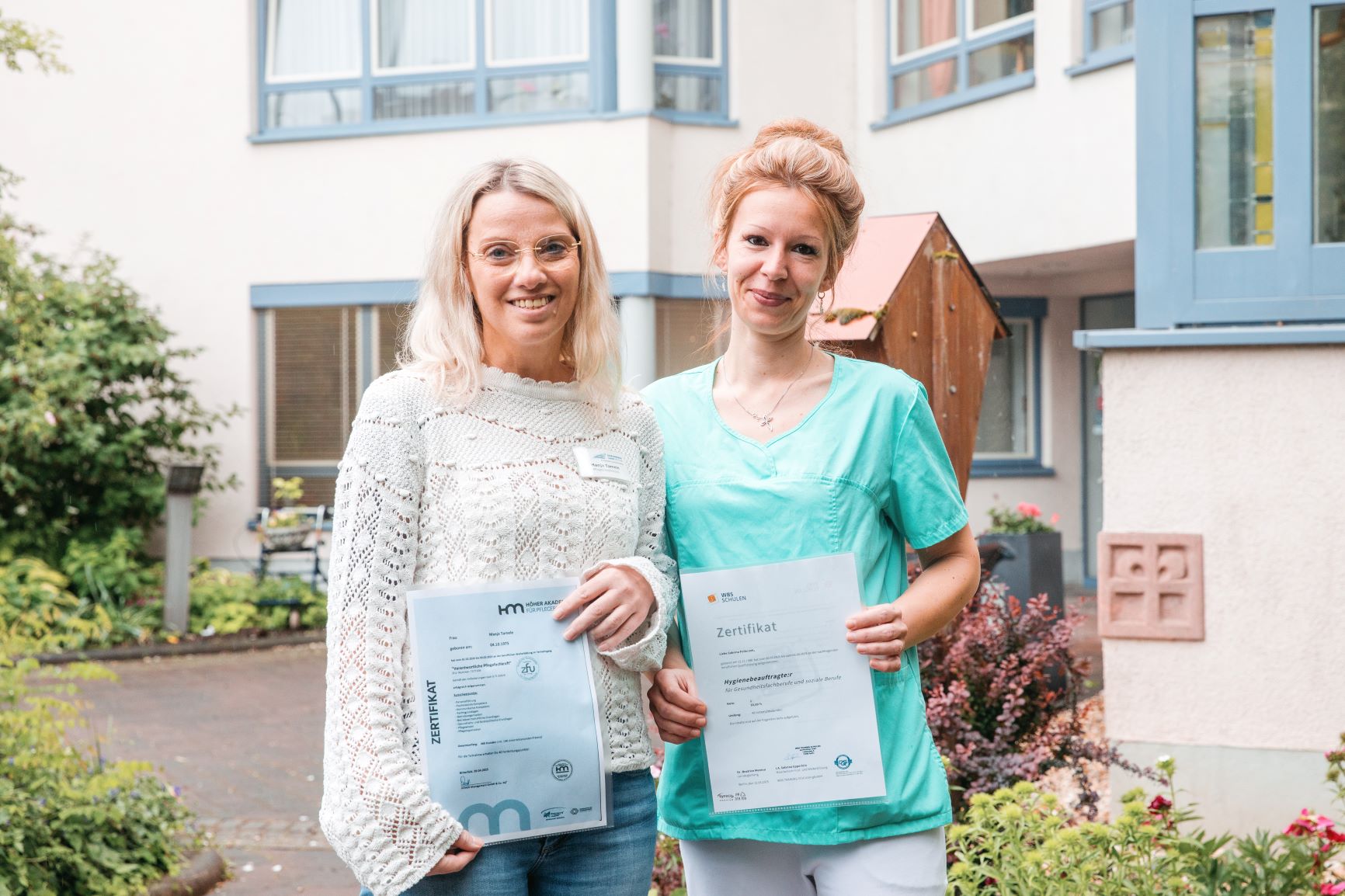 Im Johannes-Jänicke-Haus Halle ist Manja Tamele nach einem Jahr nebenberuflicher Weiterbildung nun zertifizierte Pflegedienstleiterin. Ihre Kollegin Sabrina Polloczek hat sich in einem 40stündigen Weiterbildungskurs zur Hygienebeauftragten qualifiziert.