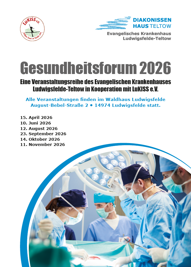 Nach der erfolgreichen Premiere im vergangenen Jahr setzen das Evangelische Krankenhaus Ludwigsfelde-Teltow und die Ludwigsfelder Kontakt- und Informationsstätte für Selbsthilfe/Selbsthilfegruppen (LuKISS e. V.) ihre gemeinsame Veranstaltungsreihe fort und laden zum „Gesundheitsforum 2026“ ein.