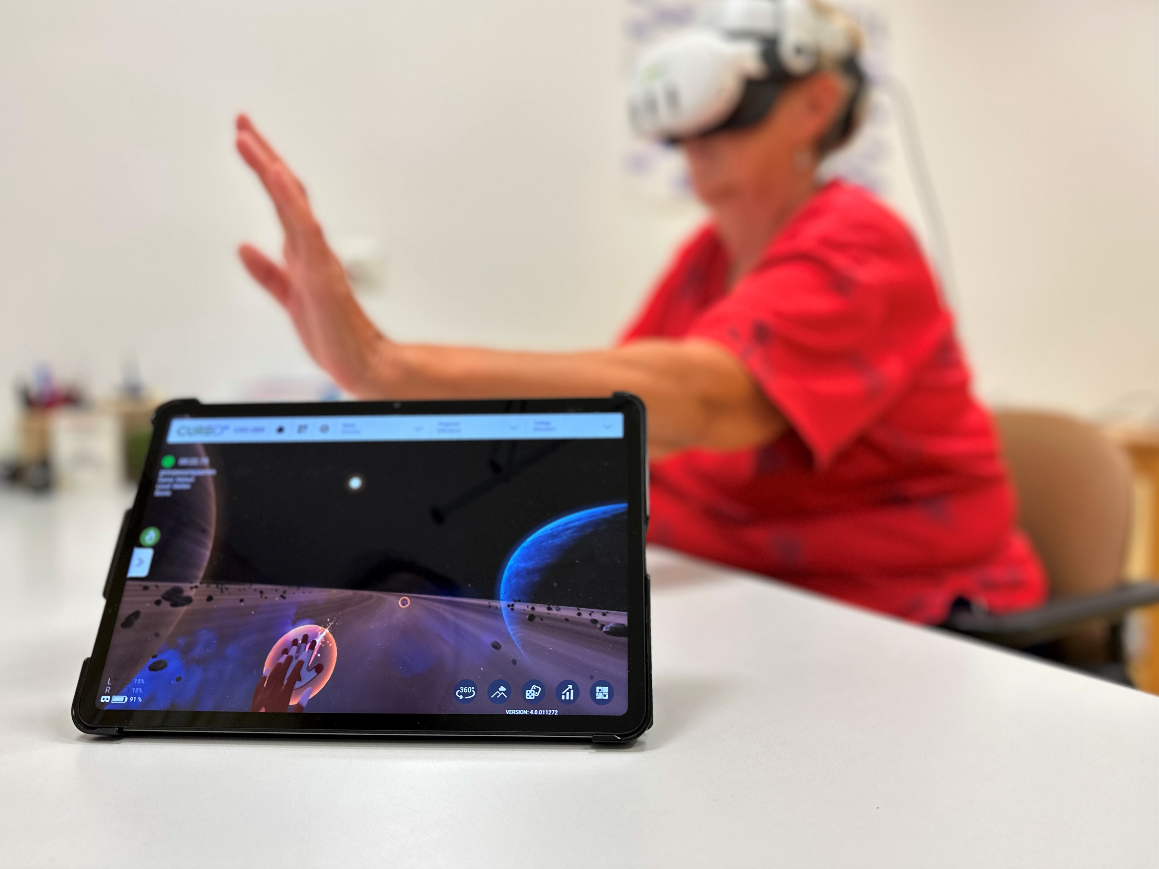 Die VR-Brille, die speziell für den therapeutischen Einsatz entwickelt wurde, erlaubt es den Patienten, in virtuelle Welten einzutauchen.