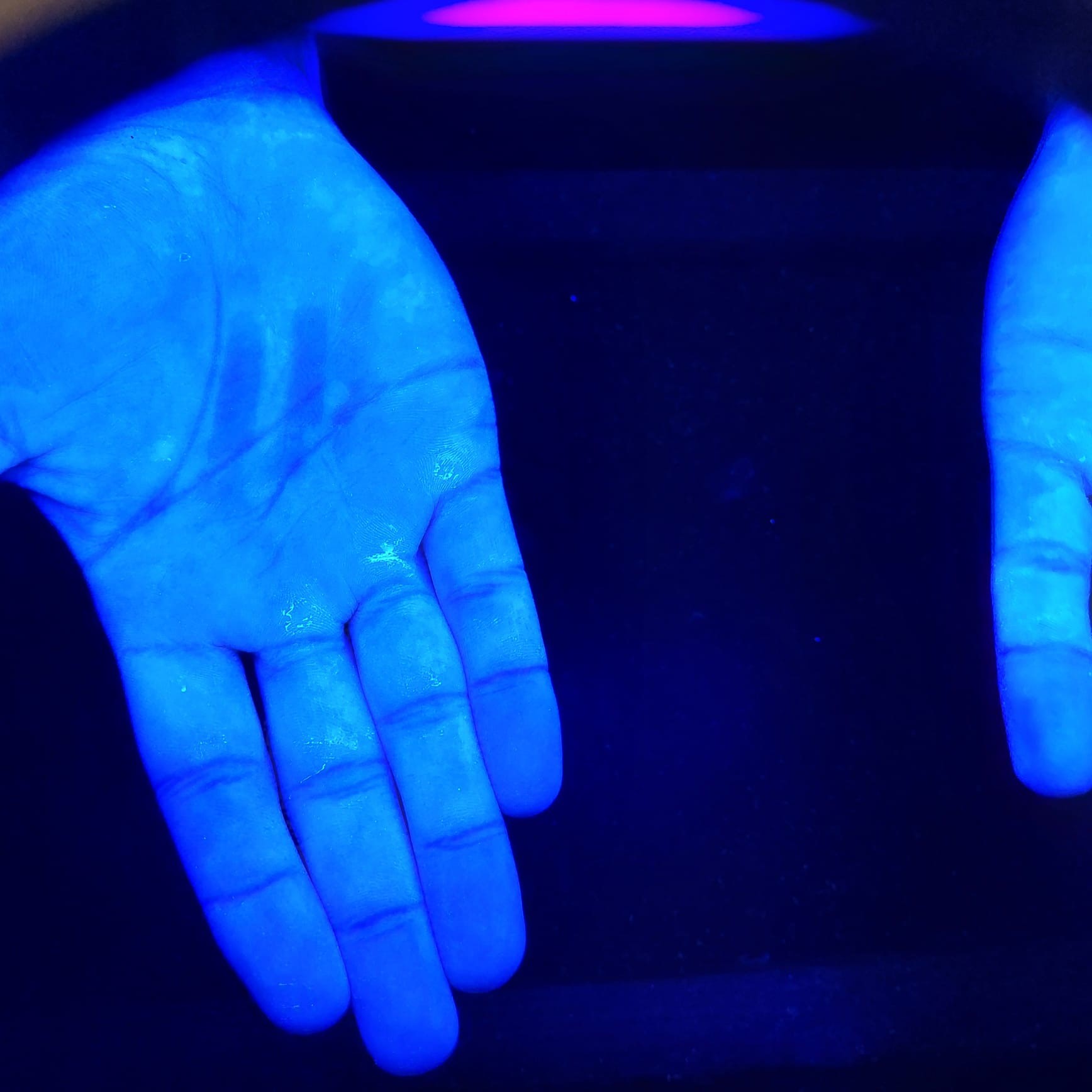 Mit UV-Lampe, fluoreszierender Desinfektion und Optic Lotion waren Kolleginnen und Kollegen in der Rehaklinik Lehnin unterwegs, um sichtbar zu machen, wie gründlich die Händedesinfektion wirklich ist.