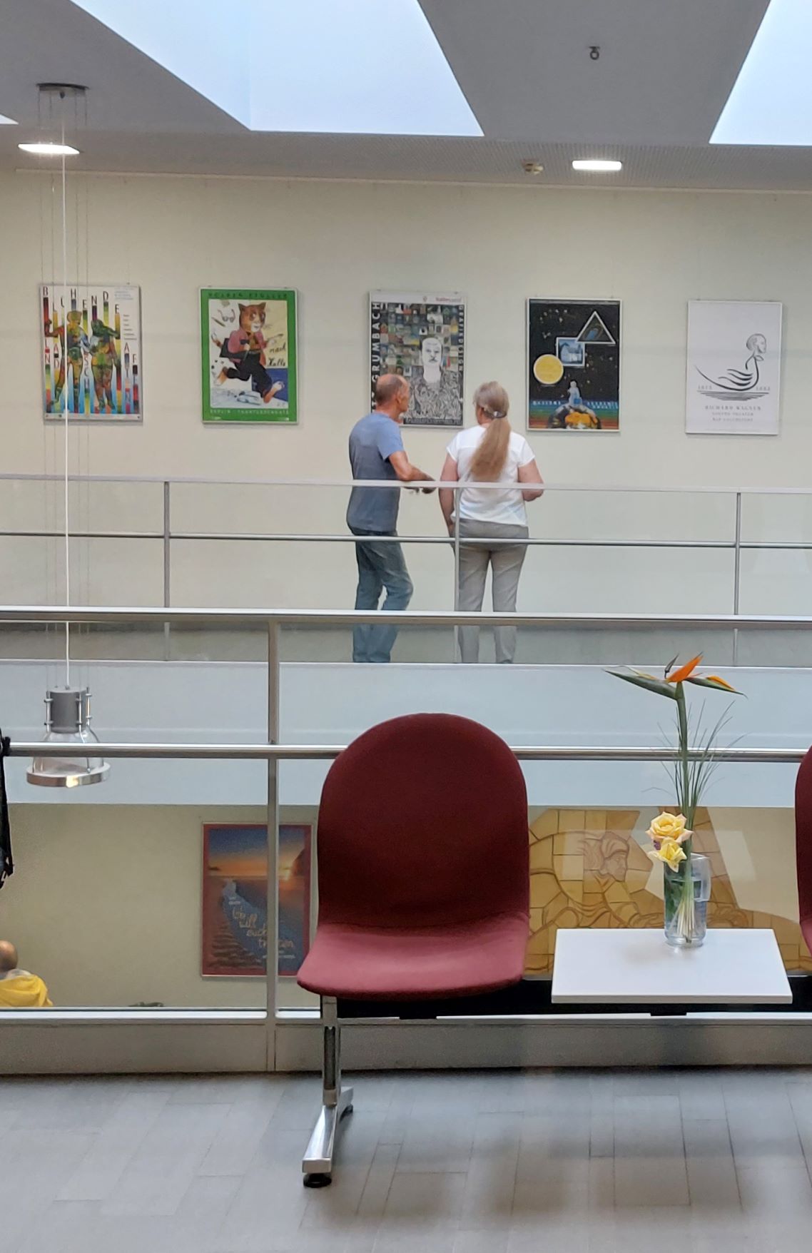 Aus diesem Grund ist im Diakoniekrankenhaus Halle ein dreiköpfiges ehrenamtliches Team aktiv und kümmert sich in unregelmäßigen Abständen um Ausstellungen im Foyerbereich. Aktuell sind Plakate des Halleschen Künstlers Lutz Grumbach zu sehen. Das Ausstellungsteam wählte aus Hunderten Motiven 12 aus, um einen Überblick und kleinen Streifzug durch sein grafisches Schaffen zu geben. Zur Eröffnung am Donnerstag, 22. August 2024, war der 83-jährige Künstler persönlich anwesend.