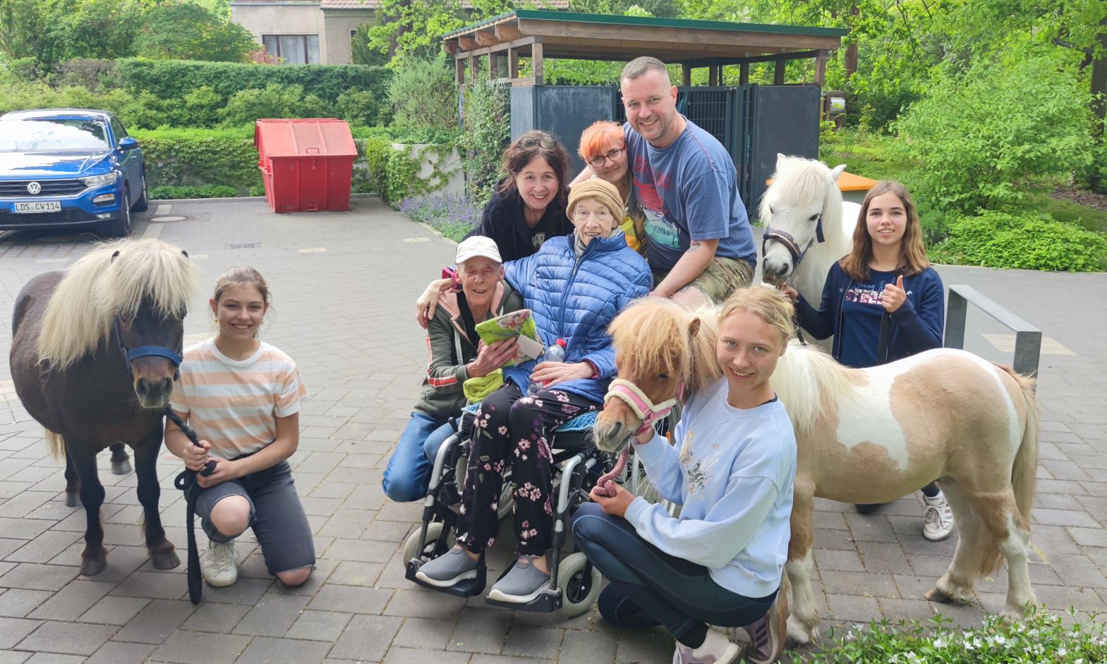 Im Evangelischen Hospiz Luckau war am 12.05.2023 Wunscherfüllertag. Klara P., Enkeltochter von Frau P. (77), kam mit den Ponys Paul, Gerrit und Ludwig (1 Jahr alt) zu einem Besuch in unser Hospiz. Begleitet wurde die Enkeltochter von ihren Assistentinnen Mariella und Philippa. Alle Drei engagieren sich auf dem Reiterhof in Willmersdorf-Stöbritz, wo am 27.05.2023 ein Frühlingsfest für Interessierte stattfindet. Die Gäste des Hospiz waren überrascht und erfreut über diesen Besuch. Die Ponys haben sich von der allerbesten Seite gezeigt. „Obwohl Pony Paul ein kleiner „Wildfang“ ist, blieb er merklich ruhig und aufmerksam im Kontakt mit den Gästen.“, sagt Klara P.