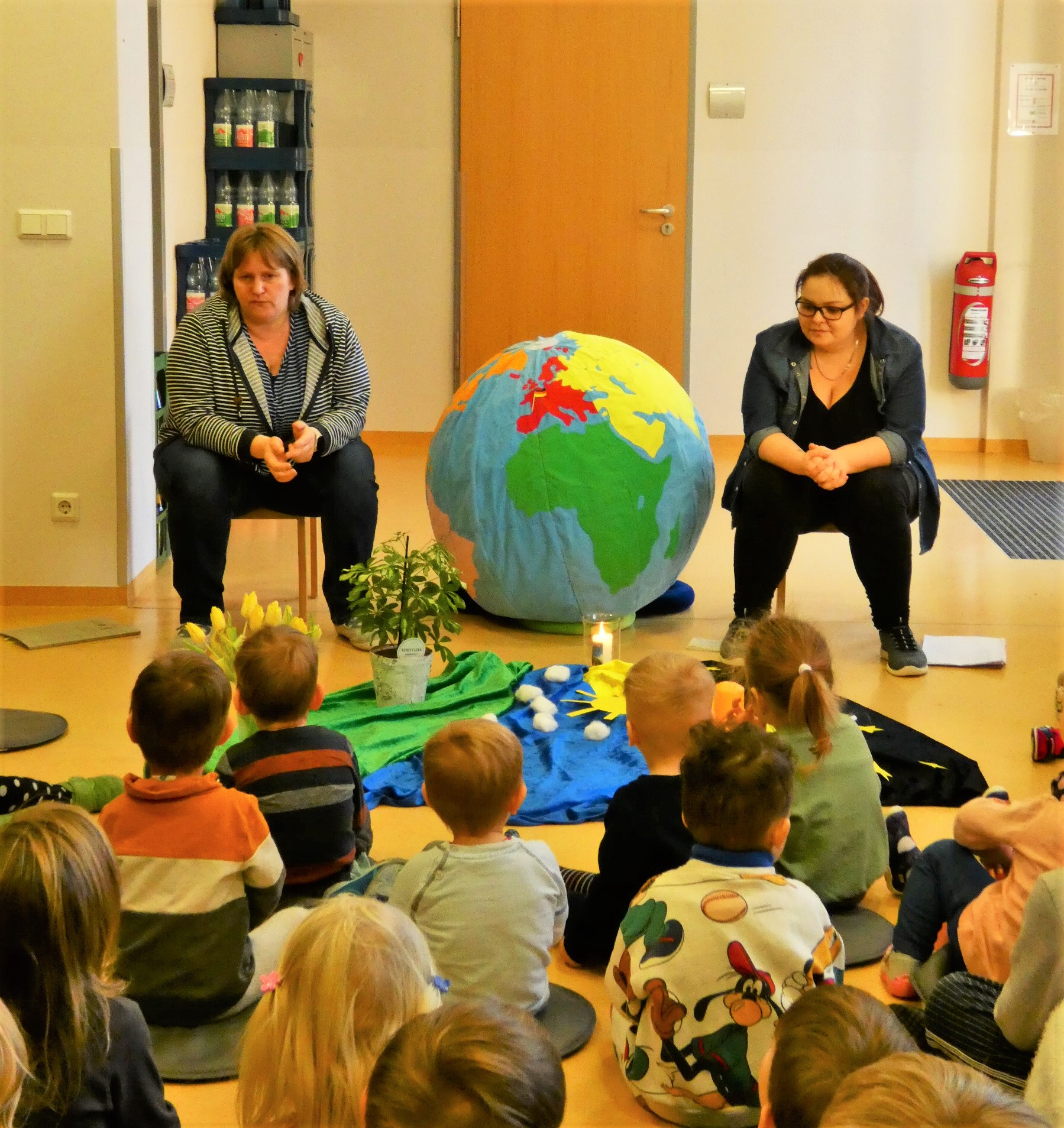 Zwei Wochen beschäftigen sich die Kinder und Mitarbeitenden der Kita mit der Schöpfungsgeschichte. Gott hat an 6 Tagen die Welt erschaffen mit Wasser, Himmel, Pflanzen, Bäumen, Tieren, Sonne, Mond und Sternen und den Menschen. Am 7. Tag ruhte sich Gott aus. Sara Graßmann und Anke Kullick haben die Andachten zur Bibelwoche gestaltet.