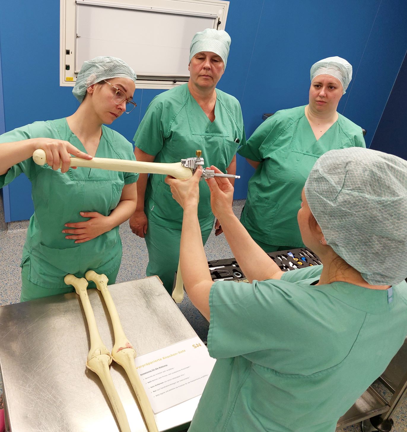 Da Revisions-OPs nicht so häufig vorkommen, sind immer wieder Auffrischungsschulungen gefragt. Am 16. April war wieder so ein Termin, in welchem an einem Plastik-Knochen Details beim Wechsel von Gelenkprothesen erläutert und trainiert wurden.