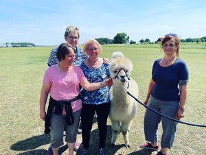Unsere Beratungsstelle für Menschen mit Demenz und ihre Angehörigen unterstützt Betroffene mit einem umfangreichen Informationsangebot. Ehrenamtliche sind eine wichtige Stütze in unserer Arbeit. Daher sagen wir D A N K E und haben Ehrenamtliche zu einem Ausflug auf den Alpakahof Elsholz (bei Beelitz) eingeladen. Über 40 Helferinnen und Helfer aus ganz Potsdam-Mittelmark verbrachten einen gemütlichen Nachmittag mit Kaffee, Kuchen und Grillwurst. Auch wurde gemeinsam gesungen.