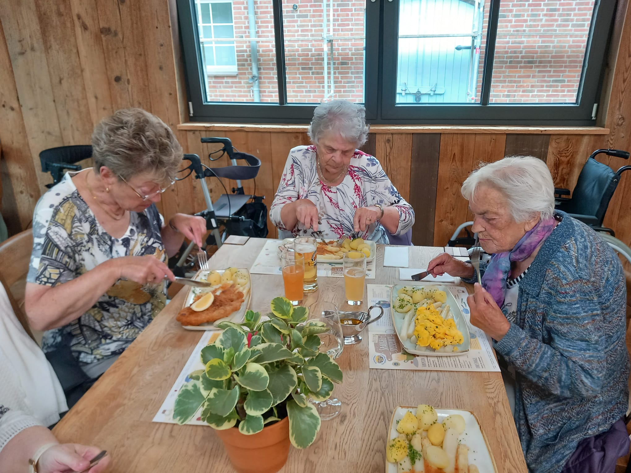 Nach einem kleinen Rundgang über das Gelände ging es ins Hofrestaurant. Unsere Bewohnerinnen und Bewohner konnten aus der Speisekarte das bestellen, worauf sie Lust hatten. Spargel mit Schnitzel, Spargel mit Rührei, Sauce Hollandaise oder braune Butter. Jeder so, wie er es wollte und gern mag. Gemeinsam hatten sie alle jedoch eins: Sie genossen den köstlichen Spargel, das Mittagessen in einem Restaurant und die Abwechslung zum Alltag in der Einrichtung. Abgerundet wurde der wundervolle Ausflug mit einem Spaziergang, bei dem wir die dort lebenden Tiere wie Schafe und Ziegen bestaunten.