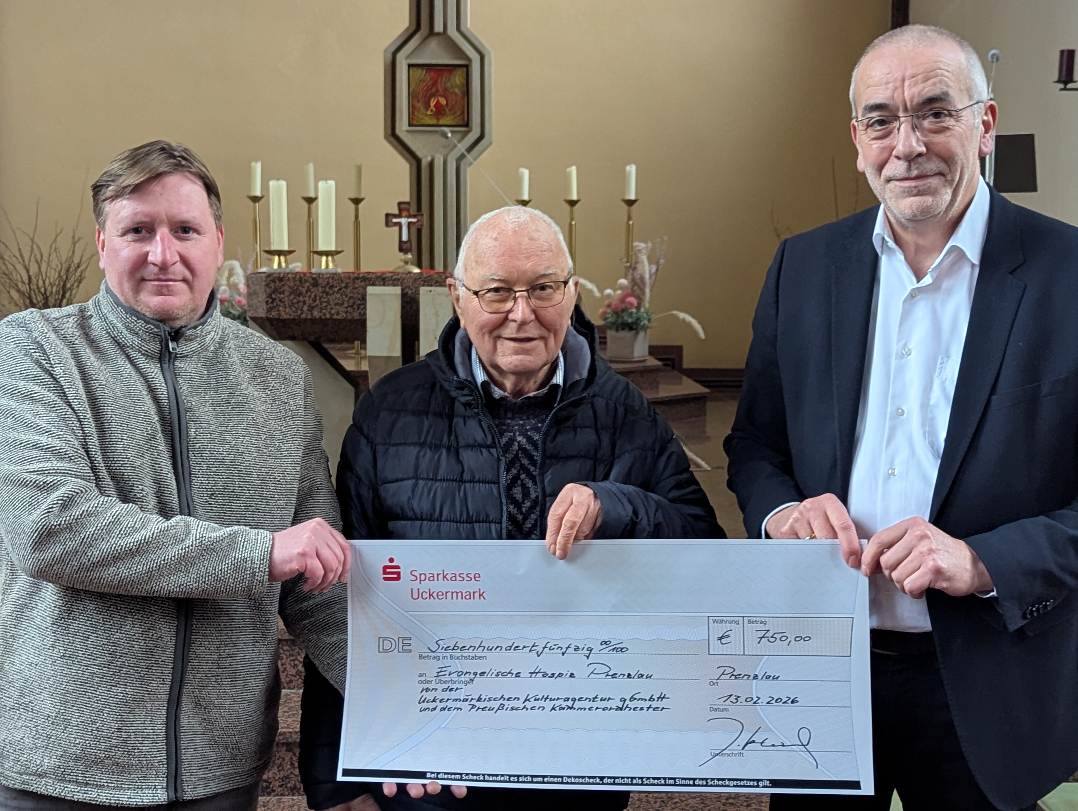 Die Uckermärkische Kulturagentur hat in der katholischen Kirche St. Maria-Magdalena in Prenzlau einen Scheck in Höhe von 750 Euro an unseren Vorstandsvorsitzenden, Matthias Blume, übergeben. Die Spende kommt dem Evangelischen Hospiz Prenzlau zugute, das sich derzeit in der Bauphase befindet und im September 2026 eröffnet werden soll.