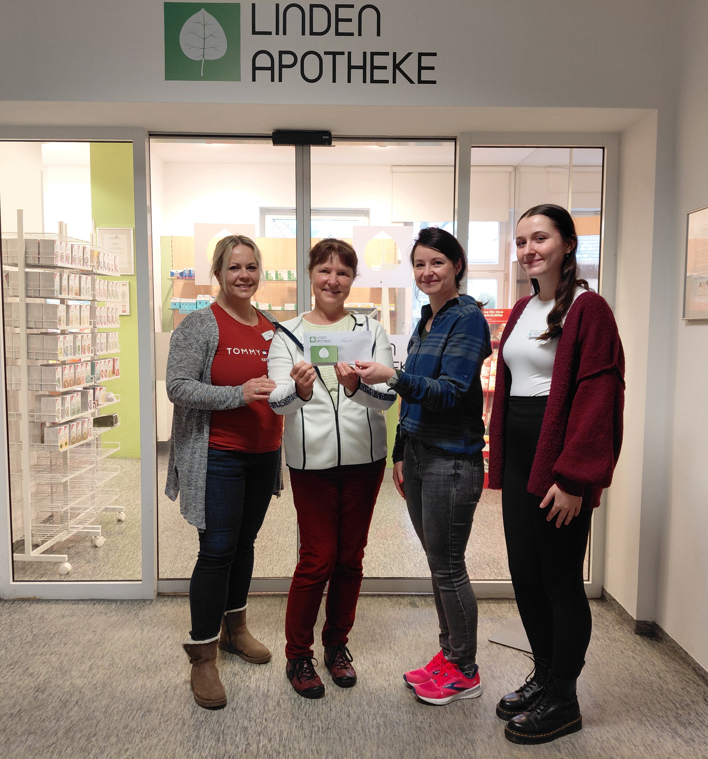 Frau Eisermann, Inhaberin der Lindenapotheken in Golßen und Luckau hat unserem Evangelischen Hospiz Luckau 650 Euro gespendet. Seit Jahren stellt Frau Eisermann Spendenboxen in ihren Apotheken auf. Vielen Dank für das tolle Engagement und natürlich auch an die Kundinnen und Kunden der Lindenapotheke.