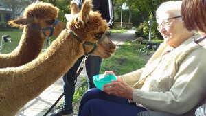 Alle 14 Tage kommt Hundetherapeutin Frau Berthold in unser Seniorenhof Mückenberger Ländchen in Lauchhammer. Hin und wieder bringt sie auch ihre Alpakas mit. Das ist natürlich ein besonderes Highlight für unsere Bewohnerinnen und Bewohner.
