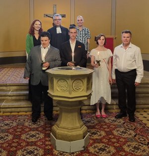 Am Sonntag, 18.6.2023 wurden drei Jugendliche unserer Wohnstätte Siloah in Berlin-Pankow konfirmiert. Auf dem Bild sind die drei Konfirmanden mit ihren Paten und dem Gemeindepfarrer Karsten Minkner. Nach einem Jahr Konfirmandenunterricht war das der lang ersehnte festliche Abschluss der Konfirmandenzeit.