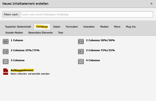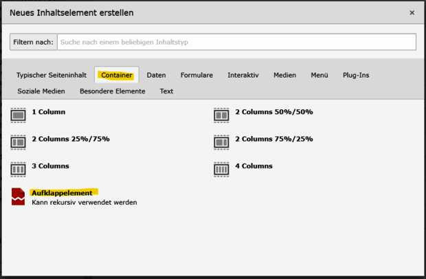 ...oder über den Reiter "Container" ein weiteres "Aufklappelement" erstellen.
