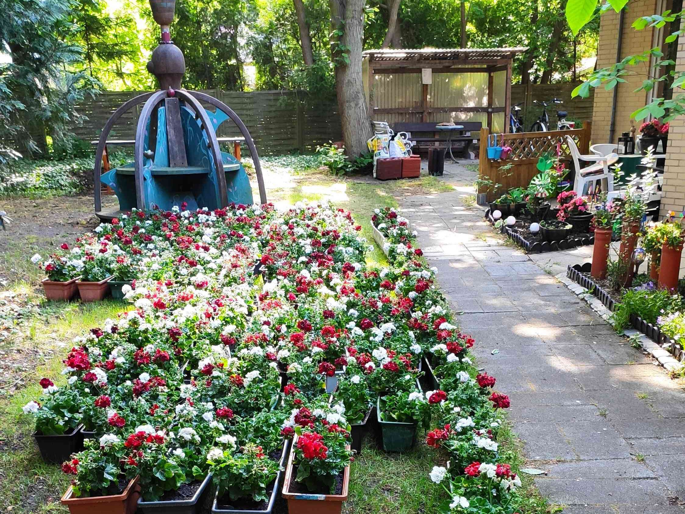Bei einem grandiosen ehrenamtlichen Einsatz pflanzten Garten-Heinzelfrauen und -männer am Heinrich- und Margarete-Grüber-Haus 400 Geranien in die Blumenkästen, an denen sich nun die Bewohnerinnen und Bewohner auf ihren Balkons erfreuen können. Als "Bonbon" zum Abschluss wurde sogar noch das Beet im Eingangsbereich von Unkraut befreit – jetzt kann der Sommer mit jedem Tag noch freudiger begrüßt werden!