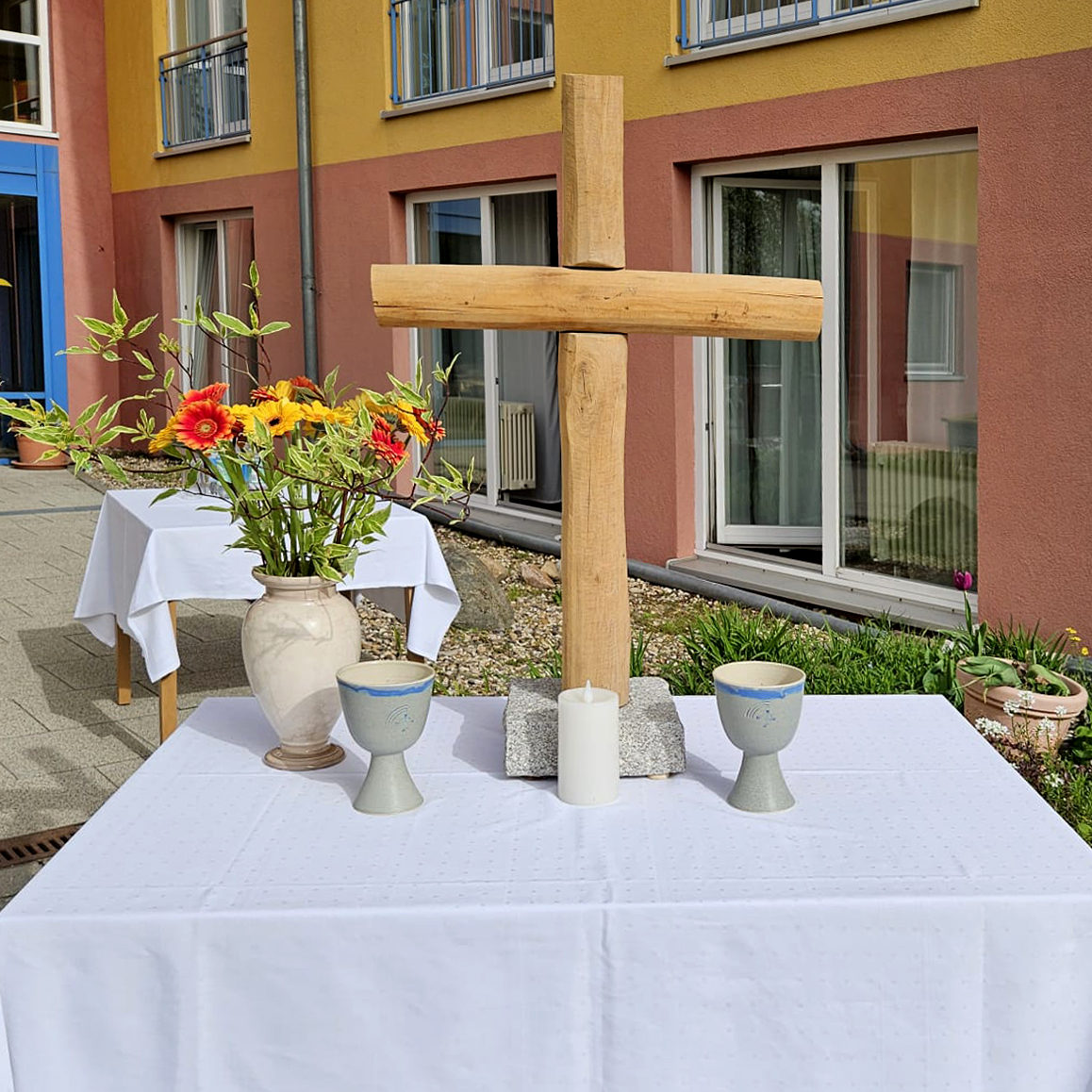 In unserem Seniorenzentrum Negendanksland in Beelitz hielten am 9. April 2024 die Bewohnerinnen und Bewohner zusammen mit den Gästen der Tagesstätte einen Ostergottesdienst ab. Bei schönstem Wetter, umgeben von bunter Frühlingsblüte freuten sich alle über die schöne Zeit unter freiem Himmel.