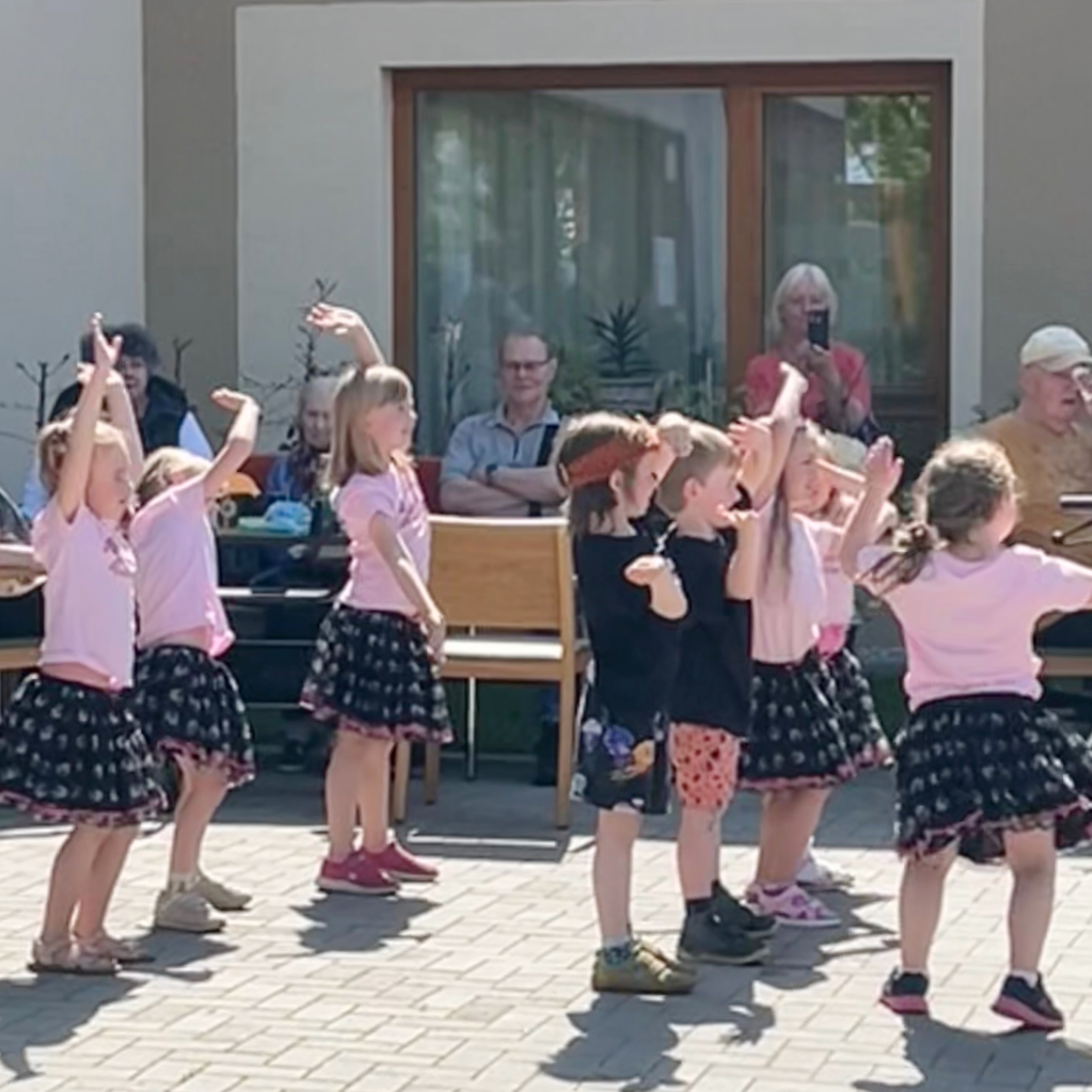 Nach der Begrüßung sorgte eine Kindertanzgruppe für einen wunderbaren Auftakt. Die 3- bis 6-jährigen Kinder meisterten ihren allerersten Auftritt mit viel Freude, Begeisterung und Bravour. Die musikalische Begleitung sorgte für gute Laune und mit Schwung und Freude wurde mitgesungen, mitgeschunkelt und getanzt. Nach über zwei Stunden bester Laune endete dieses schöne gemeinsame Fest, das durch die vielen Helferinnen und Helfer vor und hinter den Kulissen ermöglicht wurde. Ein besonderer Dank gilt den Kolleginnen und Kollegen der Betreuung, der Haustechnik, der Hauswirtschaft und den zahlreichen Ehrenamtlichen für die großartige Unterstützung.