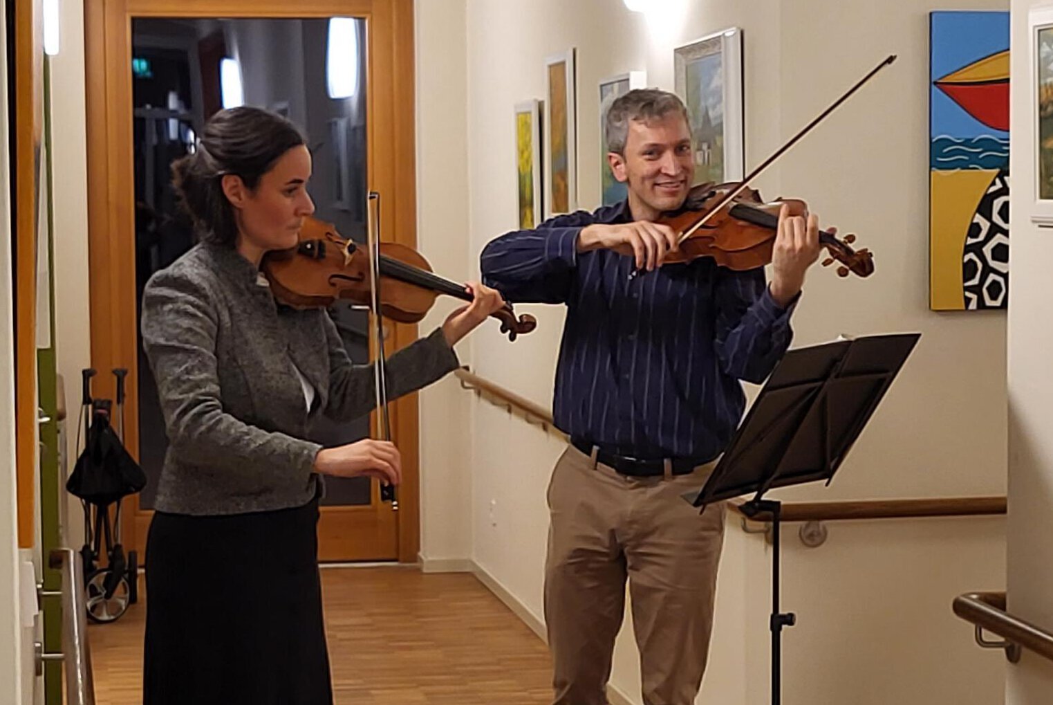 Am Nachmittag des 1. Advents wurde es in unserem Hospiz im Altenhilfezentrum Mahlsdorf musikalisch. Eine Geigerin und ein Bratschist spielten gemeinsam in den Gängen des Hospizes Adventslieder. Die Zimmertüren der Gäste wurden geöffnet. Manche Gäste kamen, von den Tönen angelockt, aus ihren Zimmern und lauschten der Musik oder sangen die ein oder andere Strophe von bekannten Adventsweisen mit. Es war eine kleine gelungene Überraschung für alle.