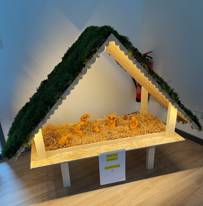 Raphael Schindler, Hausmeister in unserem Evangelischen Kindergarten Arche Noah in Caputh, war fleißig und hat eine Krippe gebaut. Eltern haben die Krippenfiguren gespendet. Ein gelungenes Projekt finden wir.