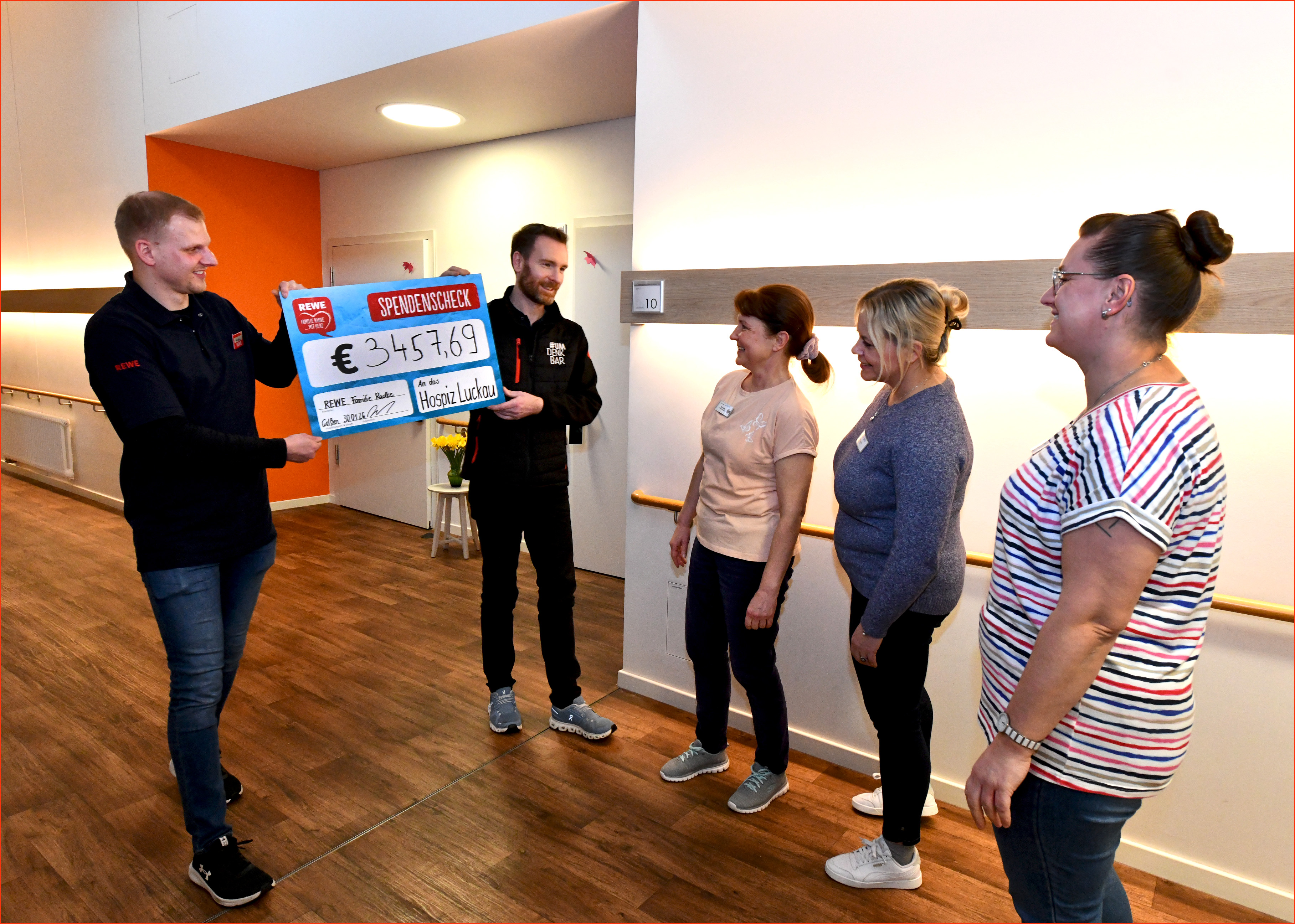 Große Freude bei der Spendenübergabe von REWE Familie Radke an das Evangelische Hospiz Luckau!