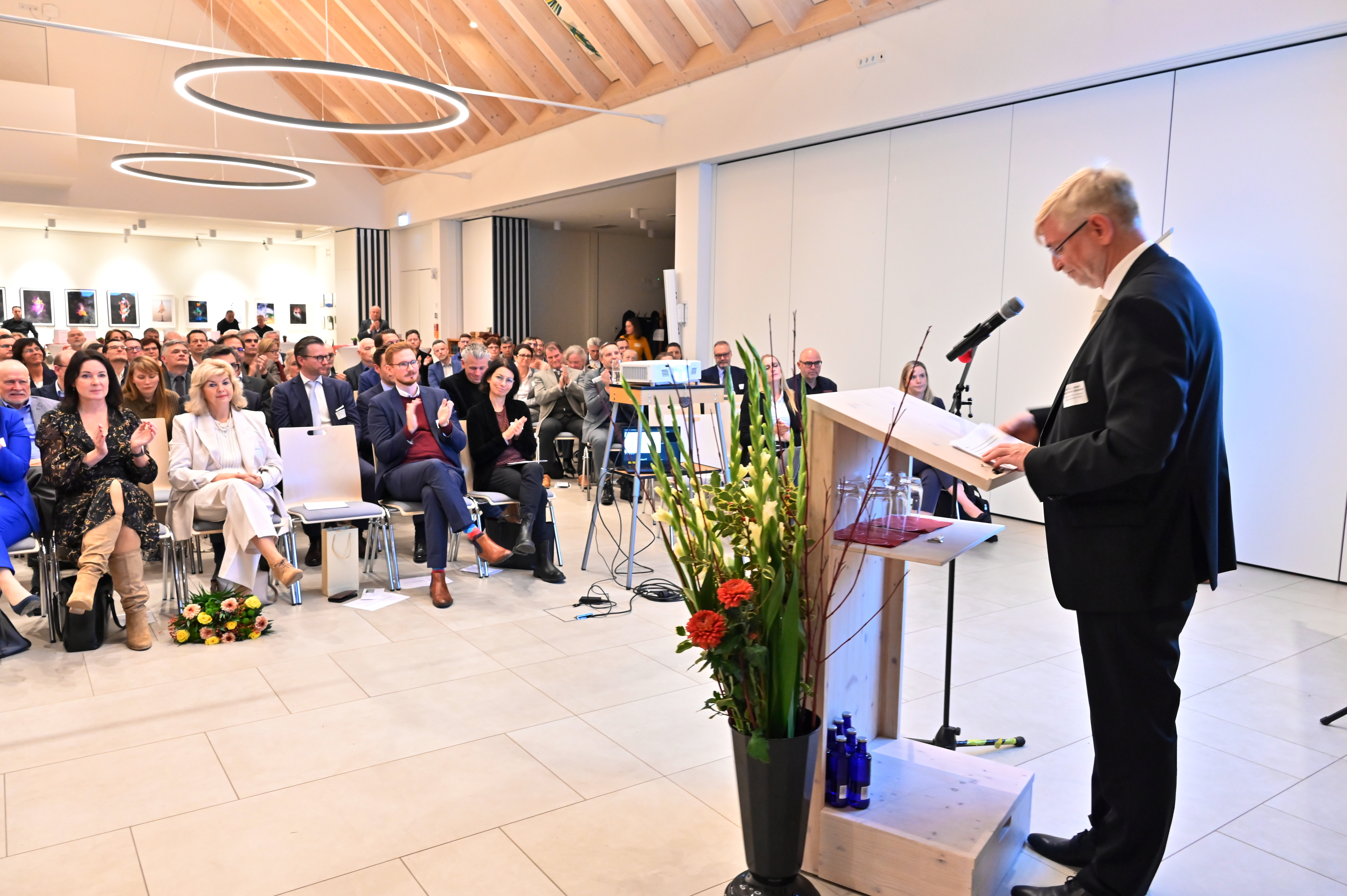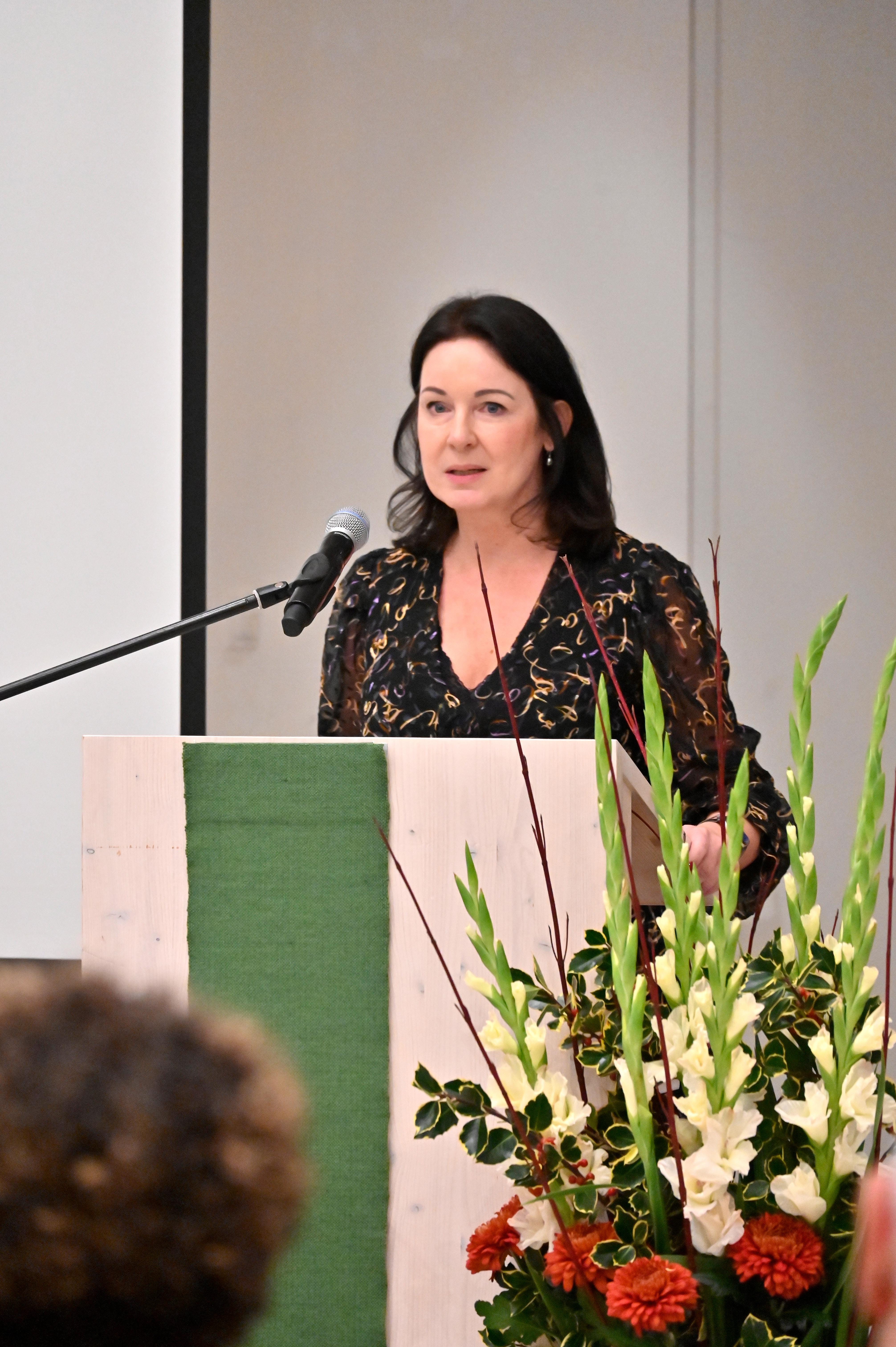 Die Festrede hielt Brigitte Meier, Beigeordnete für Ordnung, Sicherheit, Soziales und Gesundheit der Stadt Potsdam, eine Weggefährtin des neuen Kaufmännischen Vorstandes. Sie berichtete von der Zusammenarbeit mit ihm in der Leitung des Potsdamer Ernst-von Bergmann-Klinikums während Corona-Pandemie und sie bescheinigte Prof Schmidt, er habe das Unternehmen durch diese und die folgenden Krisen mit ökonomischem Sachverstand, aber auch mit menschlicher Nähe gesteuert.