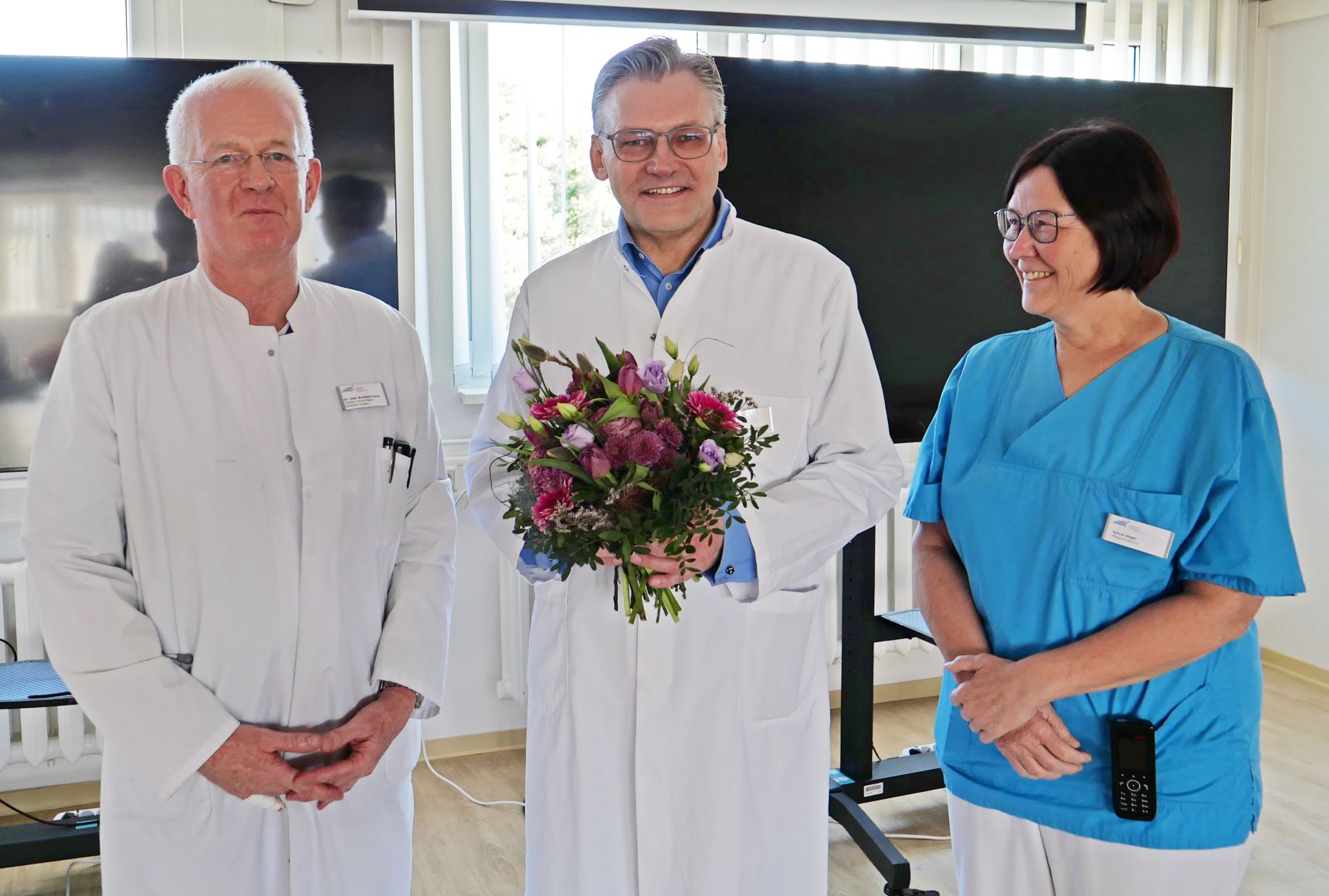 Ärztlicher Direktor Dr. Burkhard Schult und Pflegedirektorin Sylvia Unger begrüßen Dr. Boris Woldemar von Engelhardt (Mitte)