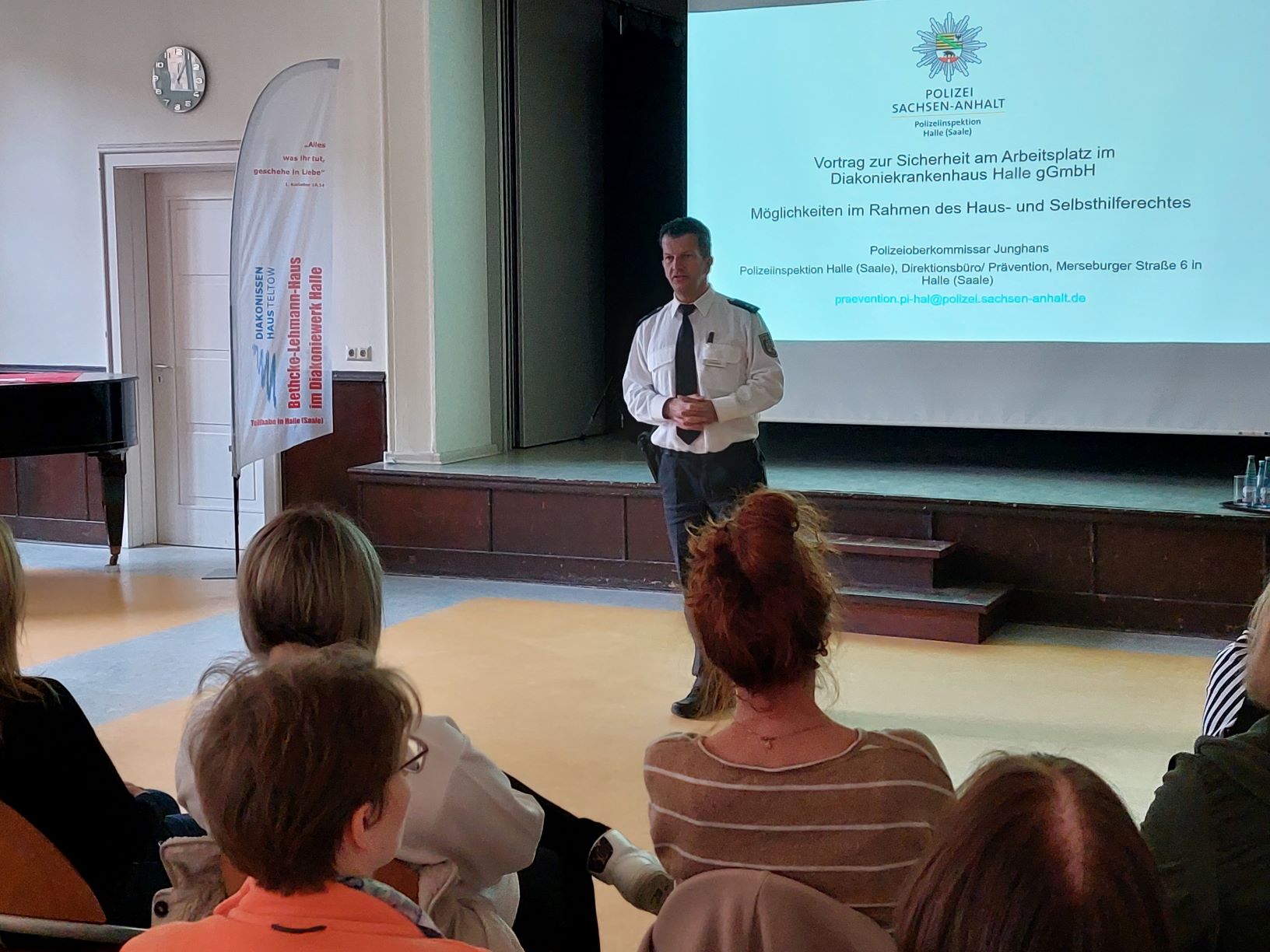 Als Reaktion darauf bot Anfang Oktober ein Mitarbeiter aus dem Team Prävention der Polizeiinspektion Halle im Diakoniekrankenhaus Halle eine erste Schulung an, in der es neben Informationen zu rechtlichen Grundlagen vor allem auch Tipps zu deeskalierendem Verhalten und entsprechender Kommunikation gab. Grundlage waren dabei vor allem reale Vorkommnisse, welche Mitarbeitende jeweils kurz schilderten.