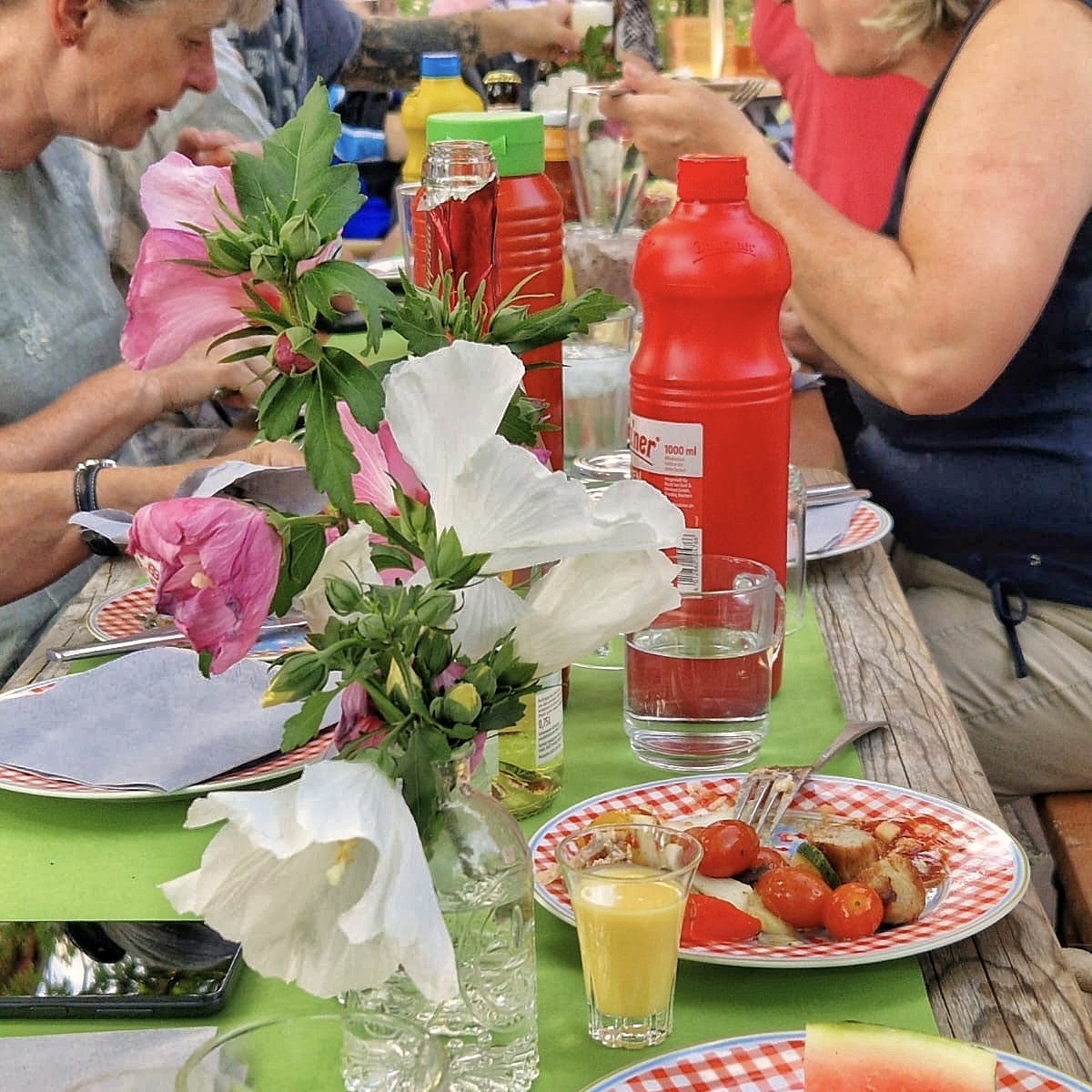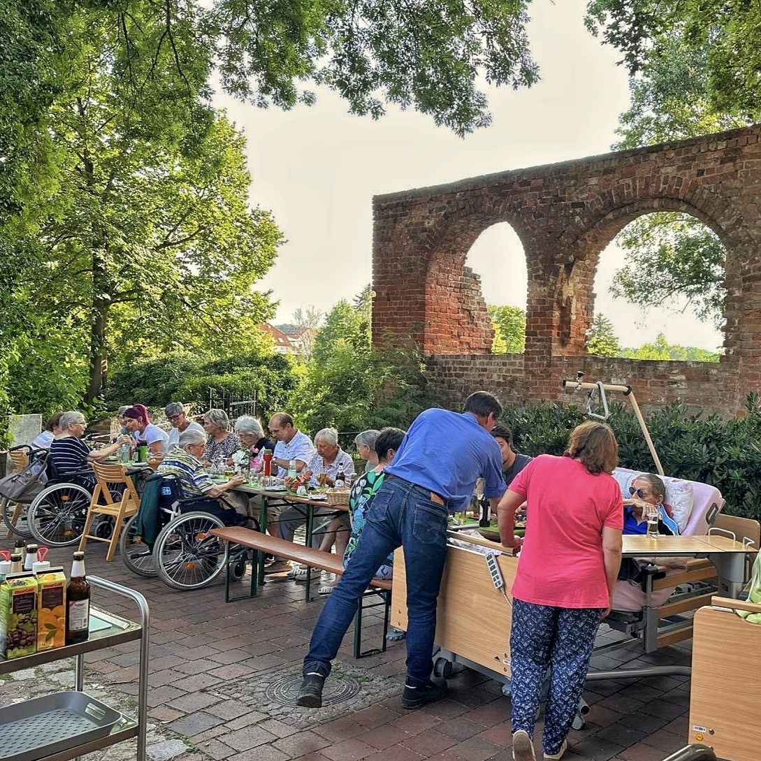 Dieser wurde kurzerhand bei einem schönen Grillfest eingeweiht. In fröhlicher und familiärer Stimmung versammelten sich fast alle Gäste des Hospizes mit ihren Angehörigen im Hof, begleitet von den ehrenamtlichen Mitarbeitenden, dem Pflegeteam und der Küchenfee. Gemeinsam wurden zuvor Salate zubereitet, die lange Tafel gedeckt und liebevoll dekoriert.