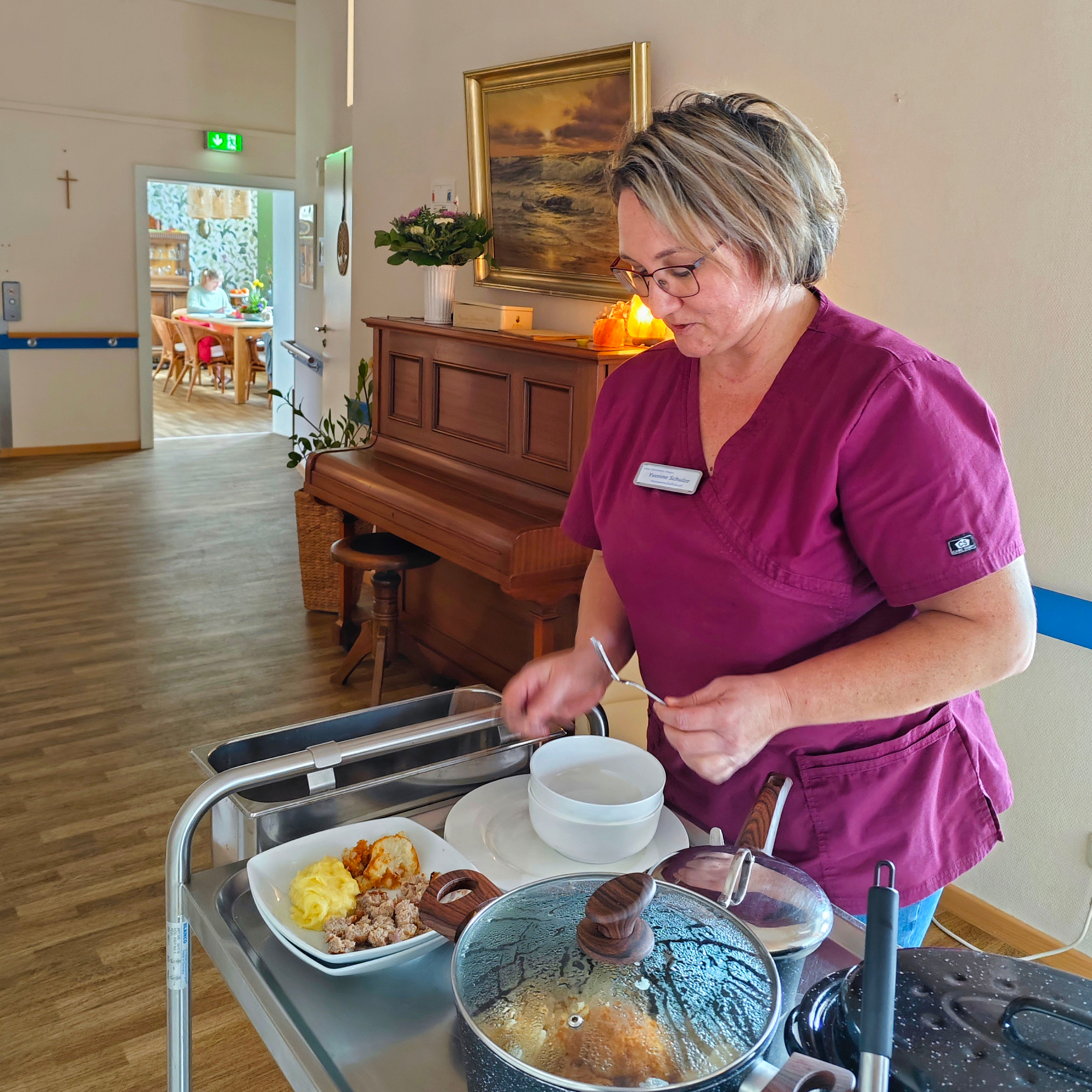 In unserem Hospiz in Lehnin werden die Gäste regelmäßig mit selbstgemachtem Mittagessen verwöhnt. Kürzlich gab es köstliche Bouletten mit cremigem Kartoffelbrei und Blumenkohl unter einer leckeren Semmelbröselhaube sowie zartes Schnitzel begleitet von frischem Spargel, Kartoffeln und samtiger Hollandaise.