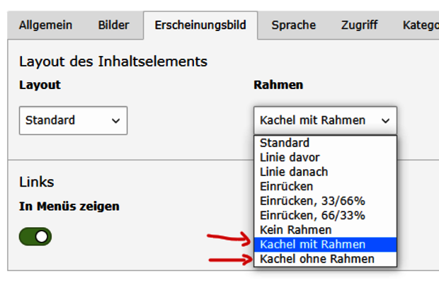 Auf den Reiter "Erscheinungsbild" gehen und bei "Rahmen" "Kachel mit Rahmen" bzw. "Kachel ohne Rahmen" auswählen.