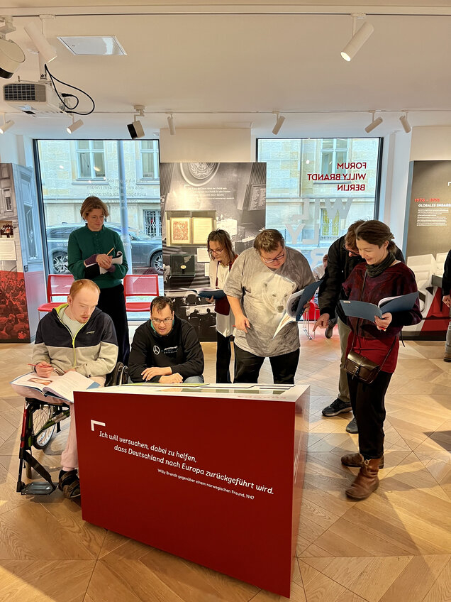 Während die Ausstellung selbst in komplexerer Sprache gestaltet ist, fasst die Broschüre die Inhalte in Leichter Sprache zusammen und dient außerdem als Orientierungshilfe.Unser Prüferteam besuchte gemeinsam das Forum Willy Brandt Berlin, um die Zugänglichkeit der Ausstellung vor Ort zu bewerten. Dabei untersuchten die Prüferinnen und Prüfer: