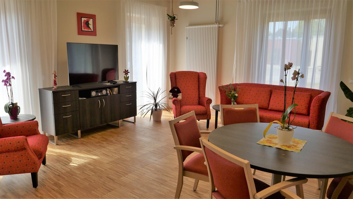 Die Tagesstätte verfügt über einen großen Gemeinschaftsraum mit Wohn- und Beschäftigungsbereichen sowie eine Gemeinschaftsküche. Die hellen Räume bieten eine gemütliche und familiäre Atmosphäre. Außerdem stehen den Gästen ein Ruheraum mit einem Bett sowie Schlaf- und Liegesesseln zur Verfügung. Bei schönem Wetter laden eine große Sonnenterrasse, Wege und Sitzgelegenheiten zum Verweilen ein. Spaziergänge werden bei jeder Witterung angeboten.
