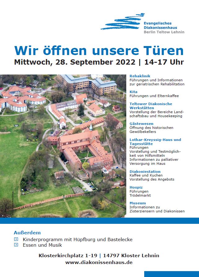 Für einen Nachmittag öffnen die Lehniner Einrichtungen des Evangelischen Diakonissenhauses Berlin Teltow Lehnin gleichzeitig ihre Türen für die Öffentlichkeit. Interessierte sind herzlich eingeladen, sich am Mittwoch, dem28. September 2022 von 14 bis 17 Uhr selbst ein Bild von den vielfältigen Angeboten des Unternehmensverbundes auf dem Gelände des ehemaligen Zisterzienserklosters (Klosterkirchplatz 1-19, 14797 Kloster Lehnin) zu machen. Im Einzelnen stehen auf dem Programm: