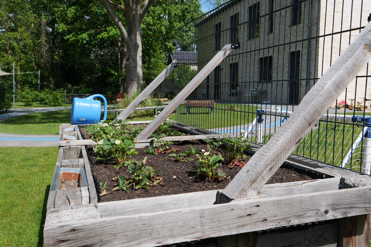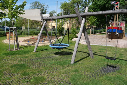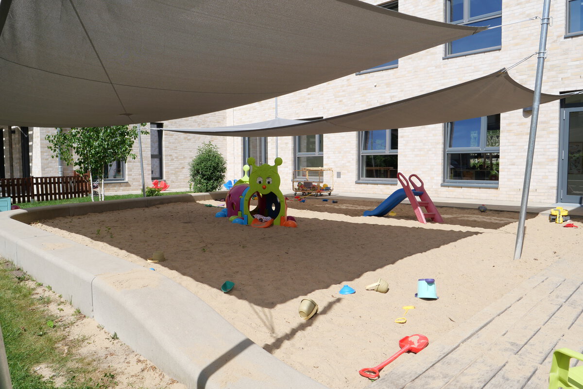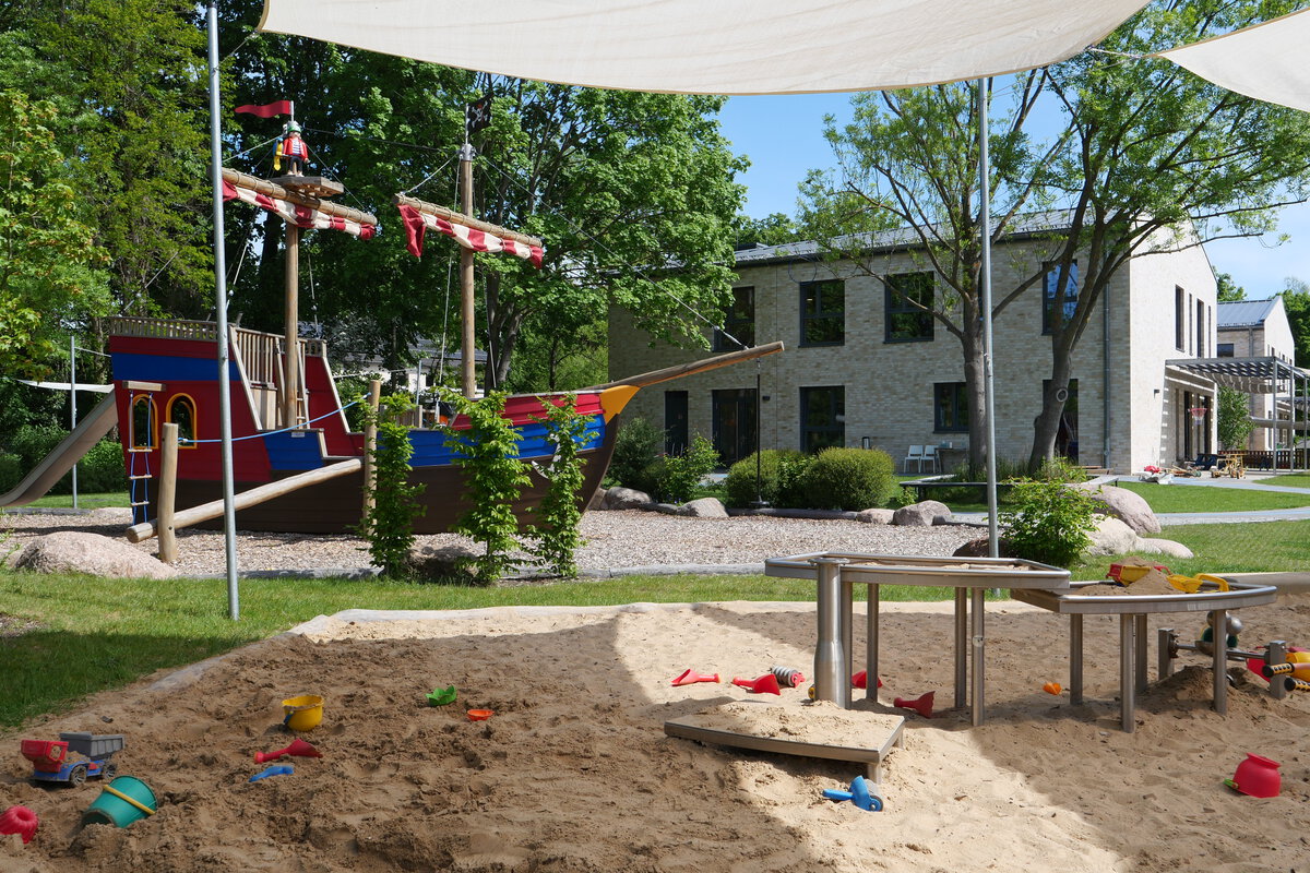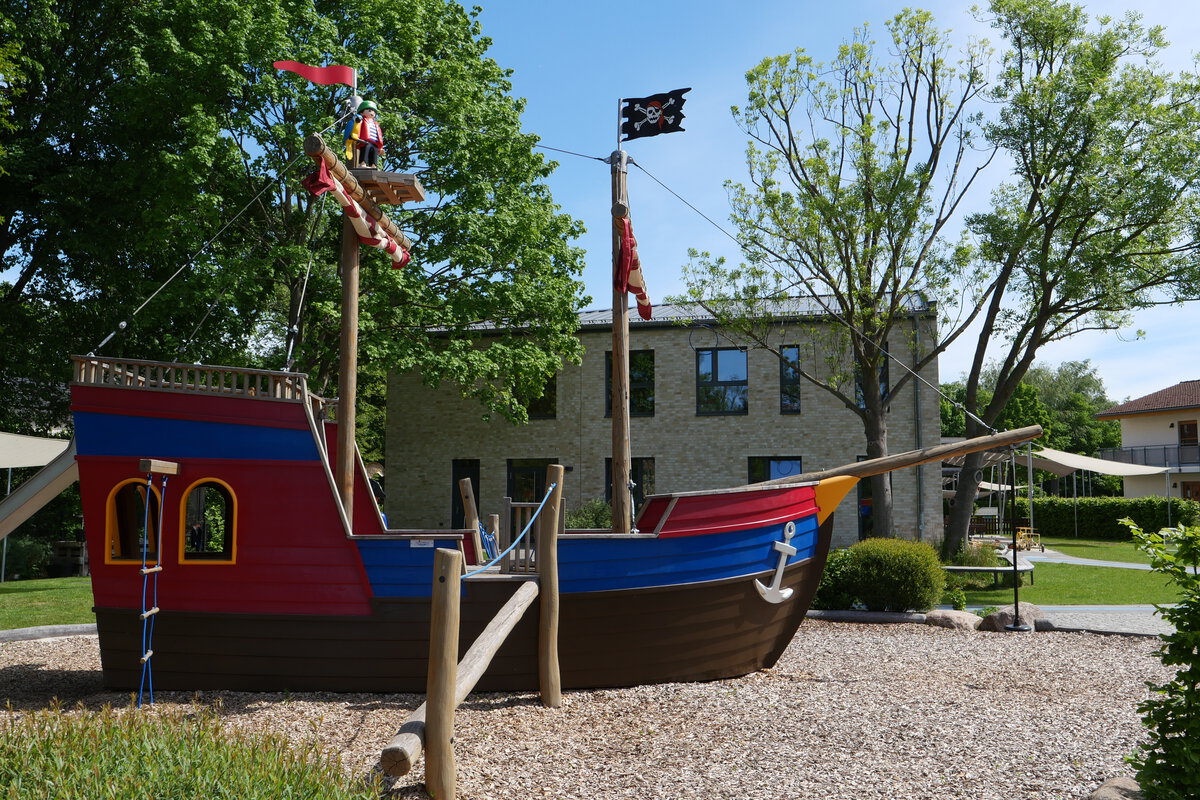 Der großzügige Außenbereich lädt die Kinder ein, draußen zu spielen und zu entdecken. Hier befinden sich mehrere Sandspielbereiche, Spielgeräte und vor allem ein großes Piratenschiff.