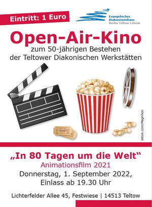 Am Vorabend des 50-jährigen Jubiläums der Teltower Diakonischen Werkstätten wird am 1. September 2022 die Festwiese des Diakonissenhauses an der Lichterfelder Allee 45, 14513 Teltow zum Open-Air-Kino. Gezeigt wird der Animationsfilm „In 80 Tagen um die Welt“, Einlass ist ab 19.30 Uhr. Der Eintritt kostet 1 Euro. Vor Ort wird es ein kleines Angebot an Getränken geben. Eigene Sitzgelegenheiten oder Decken dürfen gerne mitgebracht werden.